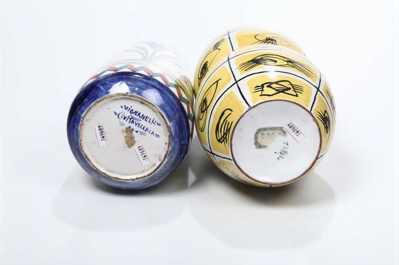 Due vasi in ceramica, uno con riquadri dipinti a fondo giallo, anni '50, l’altro a soggetti tratto dall’antico Egitto, manifattura Vignanelli Civitavecchia, anni 20-30 del '900