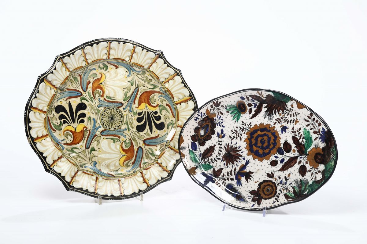Due vassoi centinati in maiolica, decoro floreale di fantasia in policromia, manifattura Molaroni Pesaro, anni 30 del '90 [..]