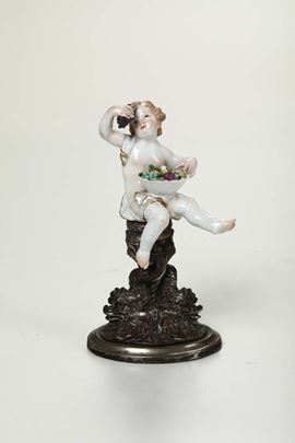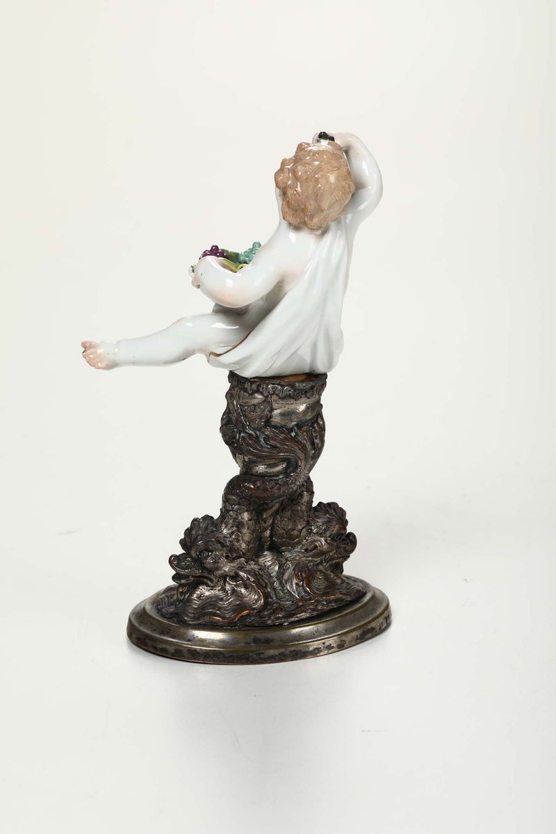 Raffigura un putto quale allegoria dell'autunno ed é montato su una base con delfini in rame argentato