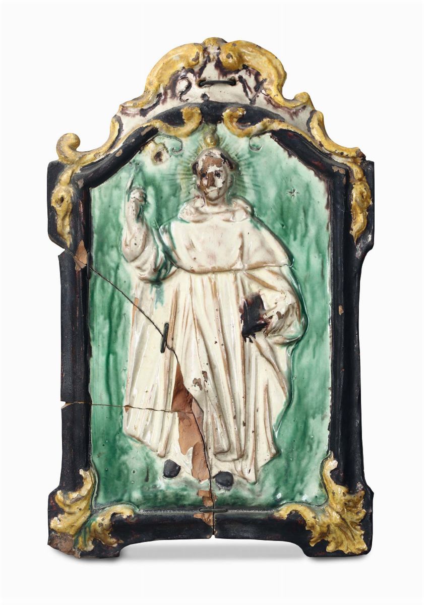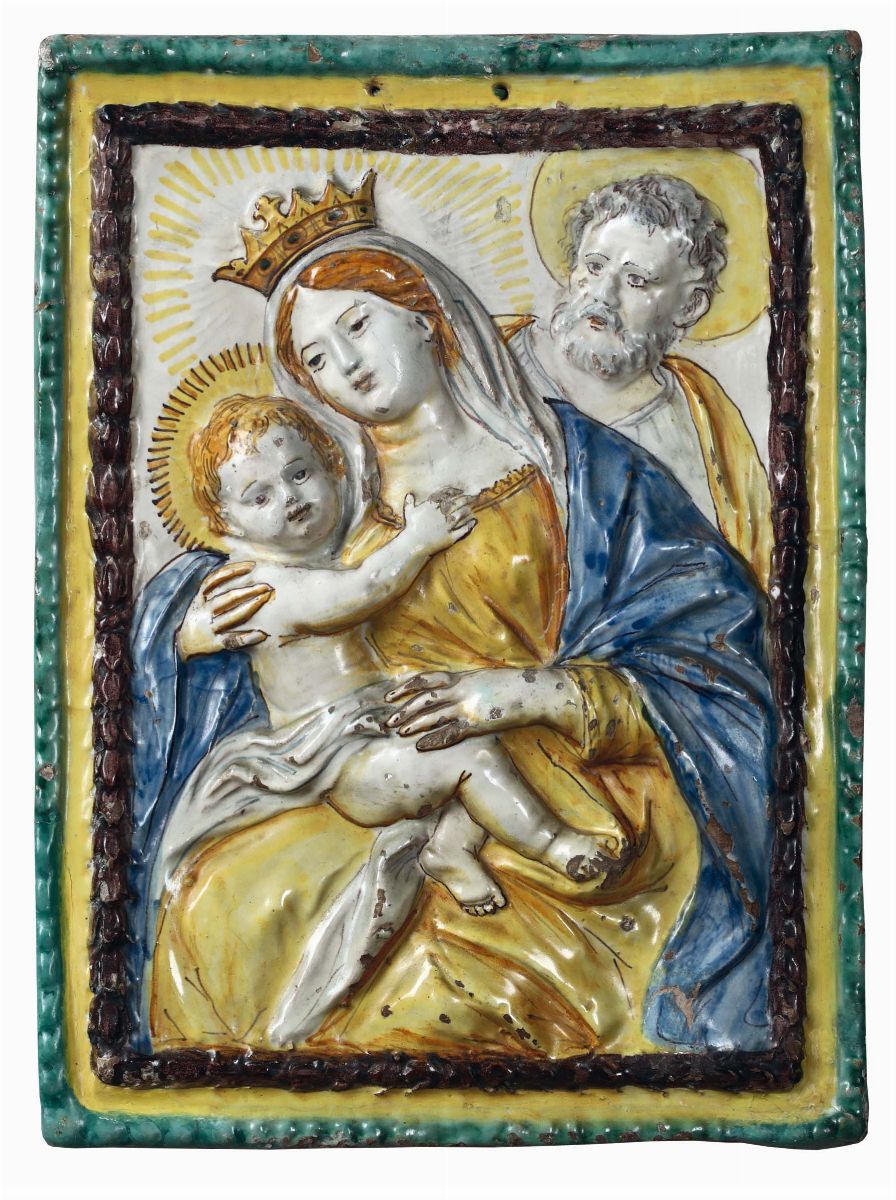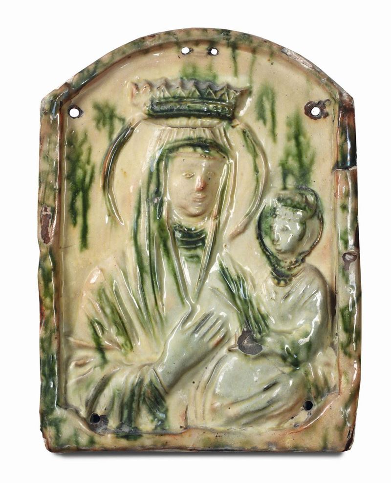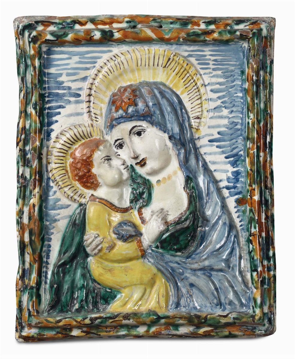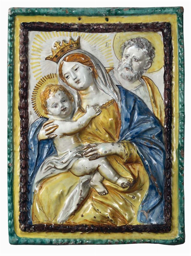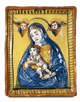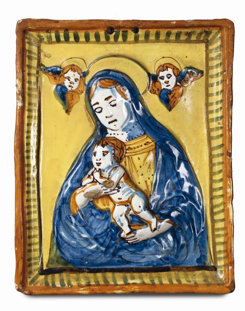 Gruppo di dieci placche in terracotta e maiolica policroma di varie epoche e misure