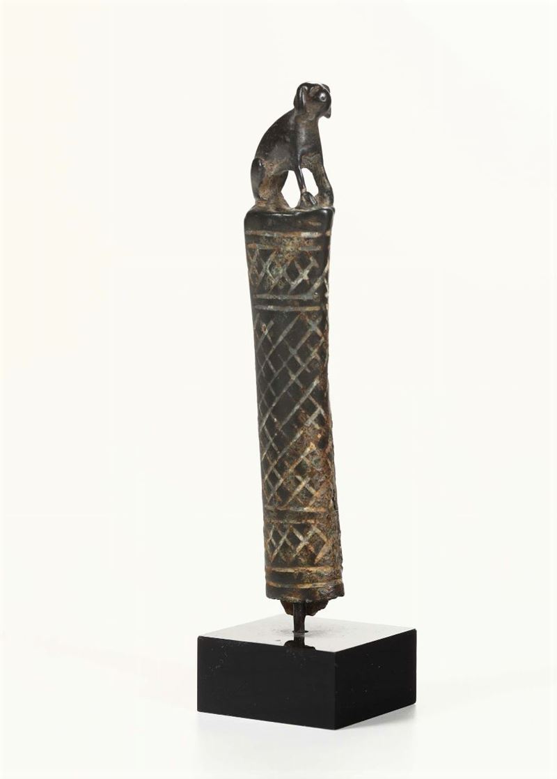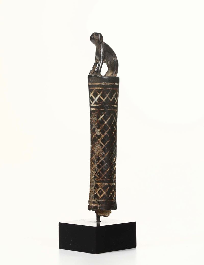 Impugnatura di coltello righettata a celle d’alveare, in bronzo, sormontata da cane stante. Arte medioevale veneta, probabilmente Verona, tra il XIII e il XIV secolo