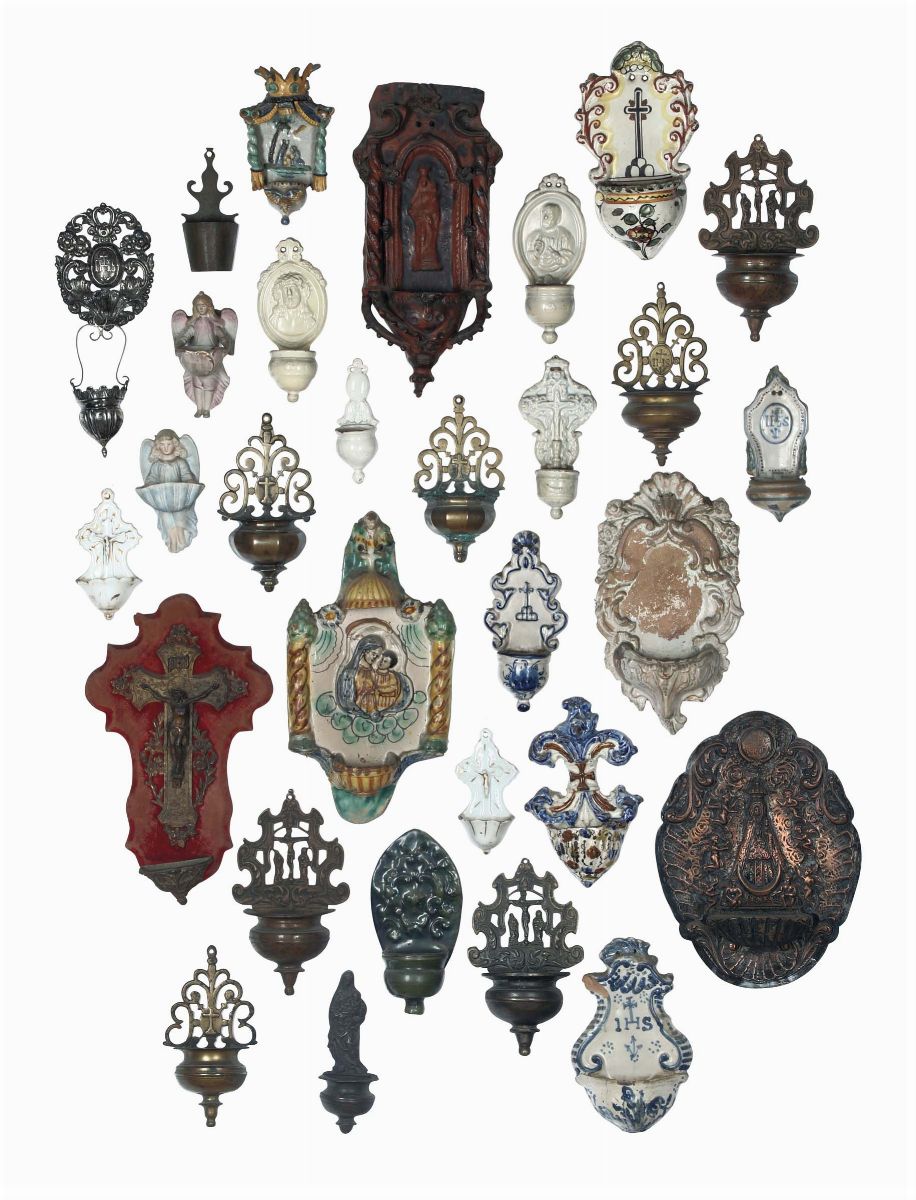 Insieme di 30 acquasantiere, epoche e materiali differenti