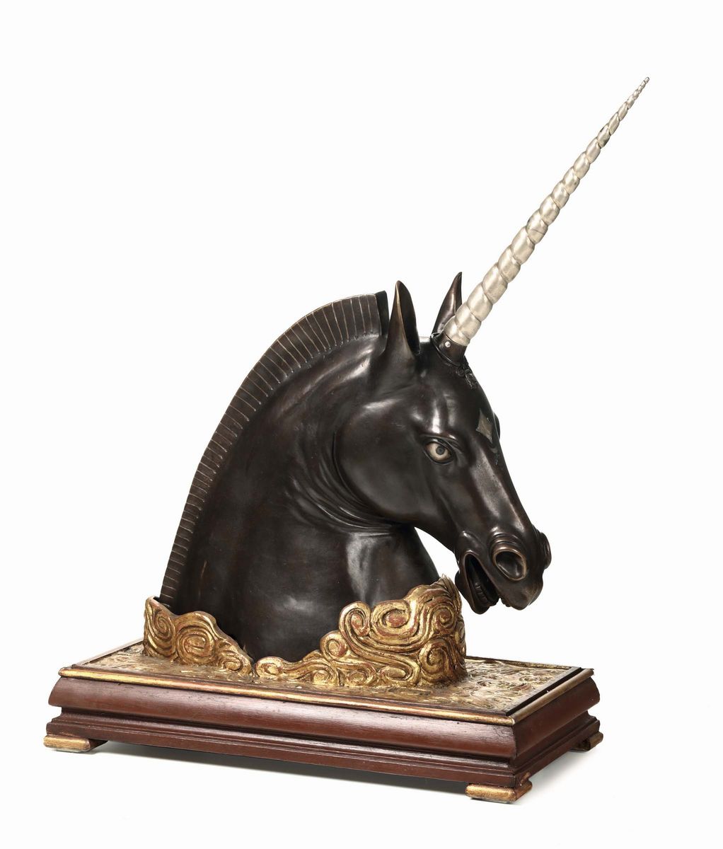 Testa di unicorno con puntale in argento a torciglione, firmato L.Pilet, Paris 1914, su base in legno dorato, cm 40x30x69