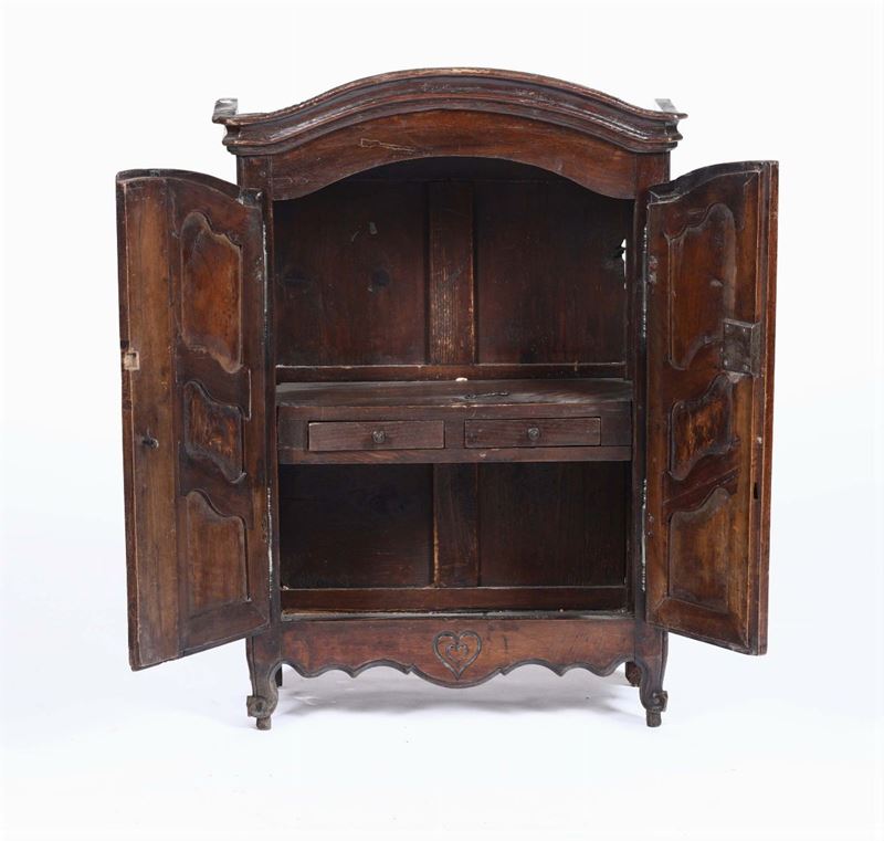fodere in legno dolce con cornici intagliate a volute, piedi a ricciolo, base e cappello centinati, cm 55x24x79