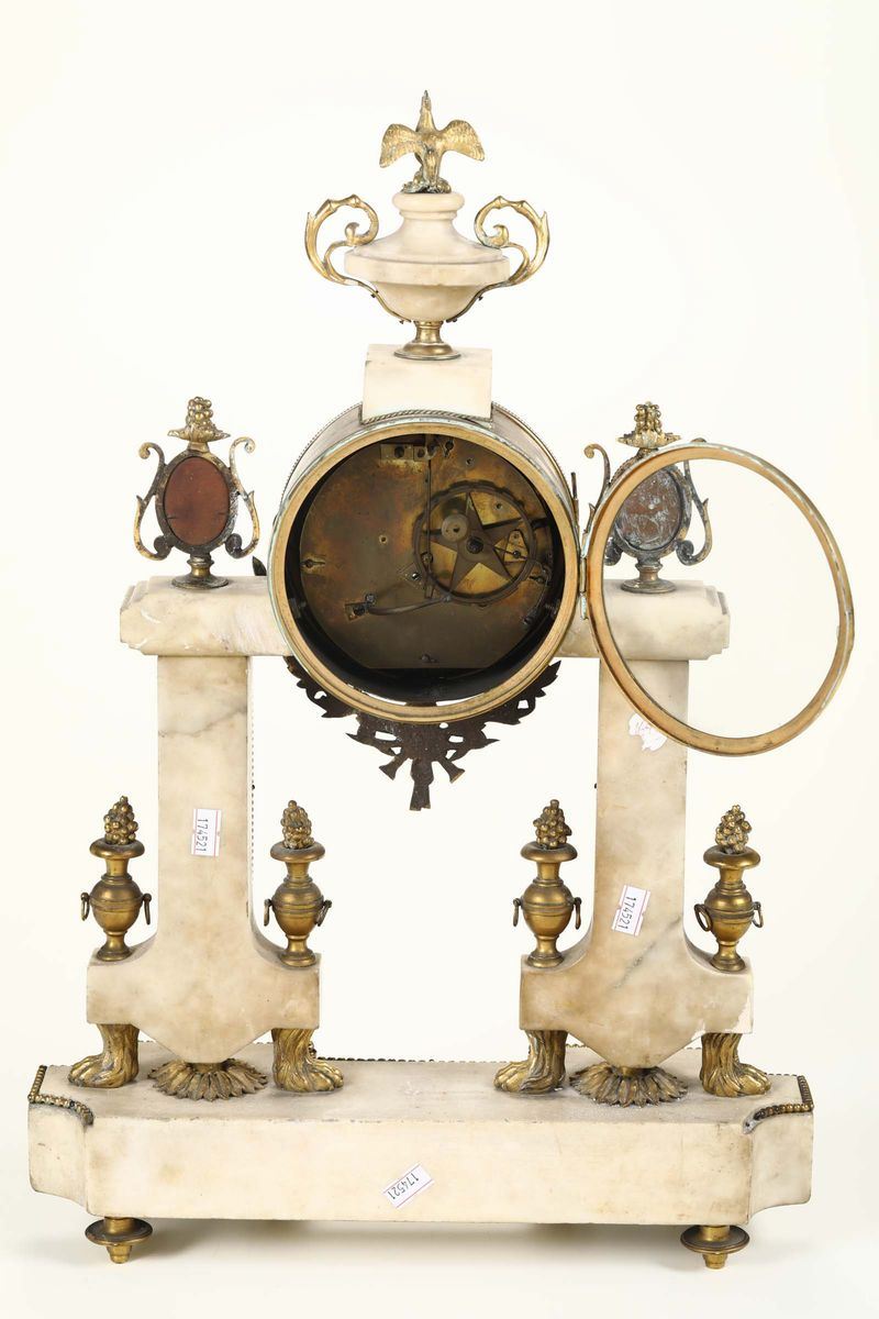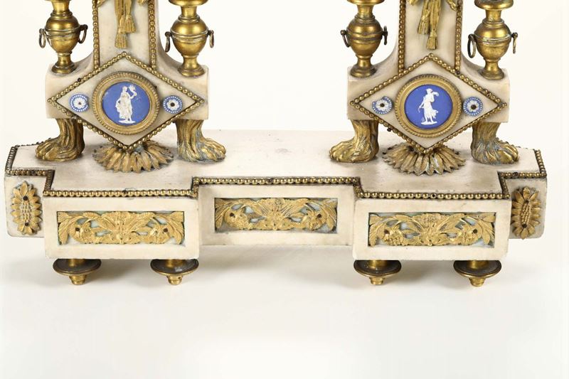 Cassa in marmo bianco e bronzi dorati con placchette in wedgwood; scappamento ad ancora; suoneria ore e mezze. Cm 35x11x50