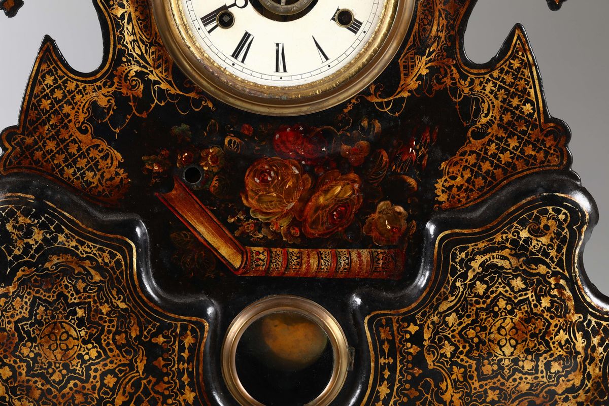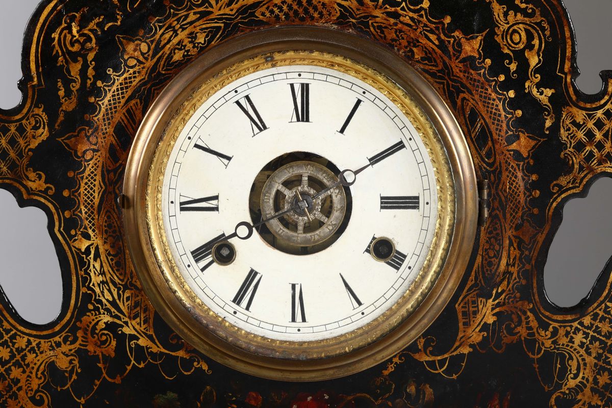 Rara pendola del Connecticut con cassa sagomata in metallo dipinto e dorato a motivi floreali. Quadrante smaltato a numerazione romana per le ore.