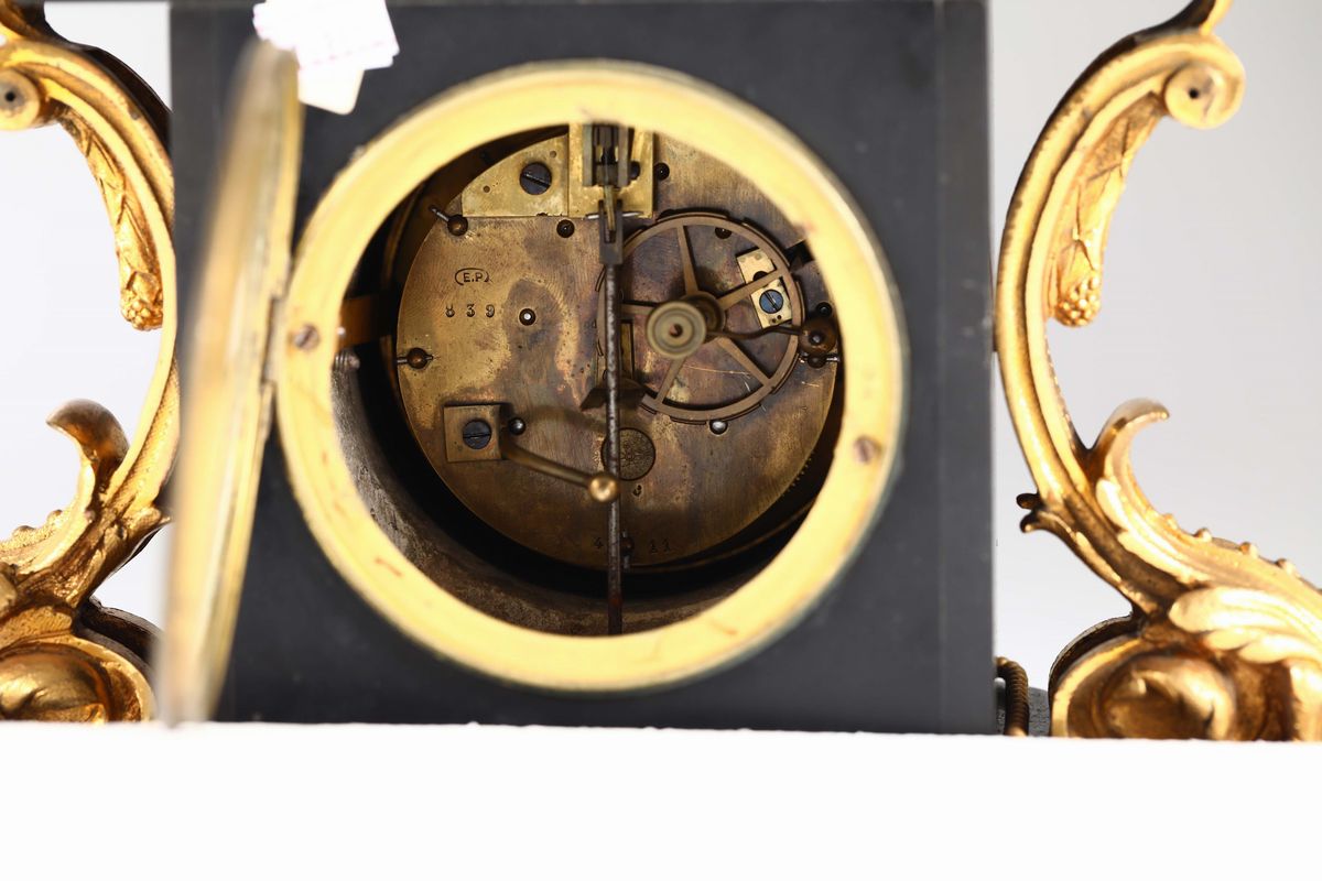 Cassa in marmo nero con guarnizioni in bronzo dorato a guisa di voluta ed elementi fogliacei. Quadrante a numerazione romana per le ore. Meccanica con sospensione a lamella e scappamento ad ancora, suoneria a ore e mezze al passaggio.