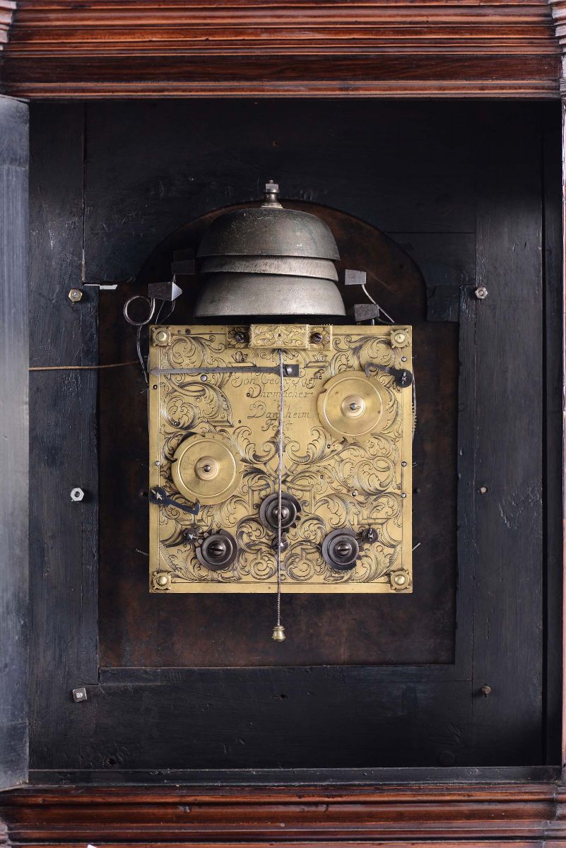 Cassa in legno con guarnizioni e piedini in bronzo dorato. Quadrante in metallo argentato con interno dorato, numerazione in numeri romani ed arabi. Firmato John Georg Rieff. Meccanica con plancia incisa, scappamento a verga, suoneria a sei ore e quarti su campane.