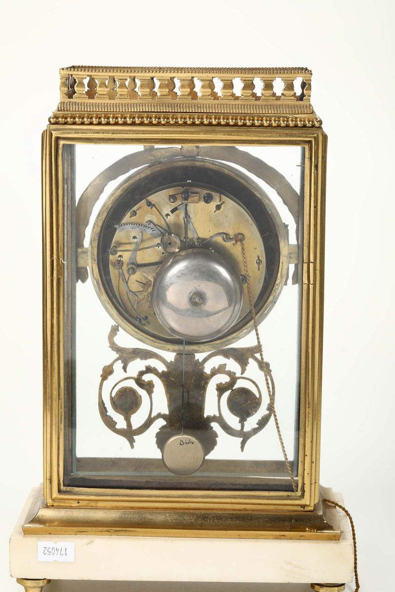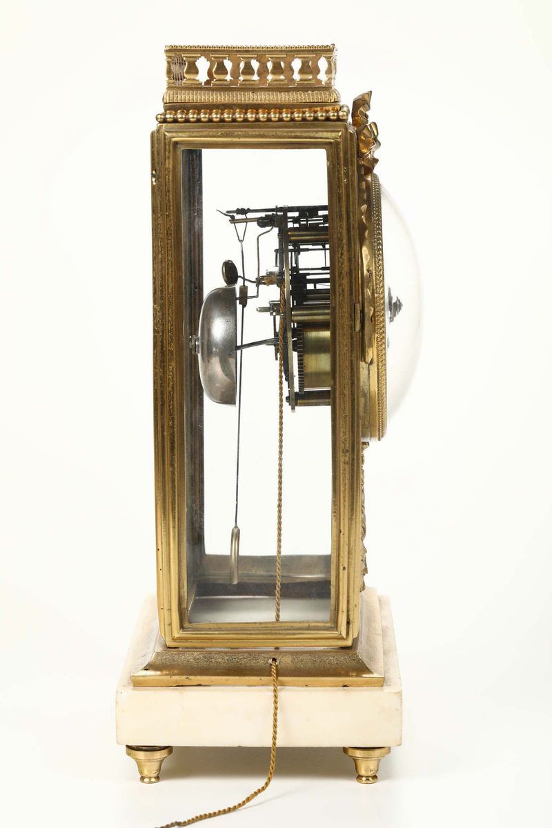 Cassa in bronzo dorato poggiante su base in marmo bianco, quadrante smaltato a numerazione araba per le ore e la minuteria, cm 21x12x32