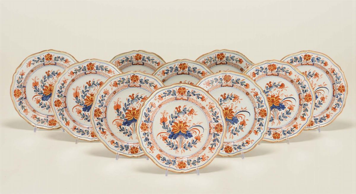 Il motivo decorativo di questi piatti é ispirato all’oriente. Il cavetto é decorato con il “fior di loto”: un grande fiore affiancato da steli fioriti e fogliati. La tesa, dall’orlo sagomato con lievi costolature, é delimitata da un graticcio ed ospita quattro mazzetti di fiori