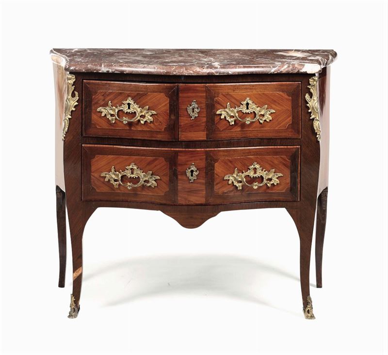 fronte e fianchi mossi, maniglie, boccachiavi ed applicazioni in bronzo dorato, piano in marmo sagomato, cm 94x45x82