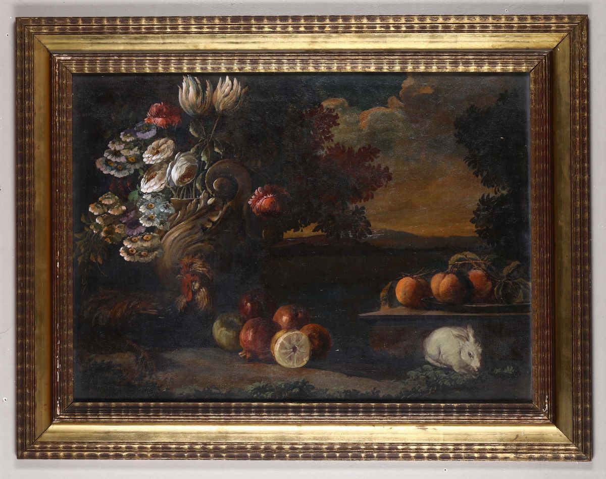 Pittore del XIX secolo Natra morta con fiori e frutta; Natura morta con fiori, frutta e animali