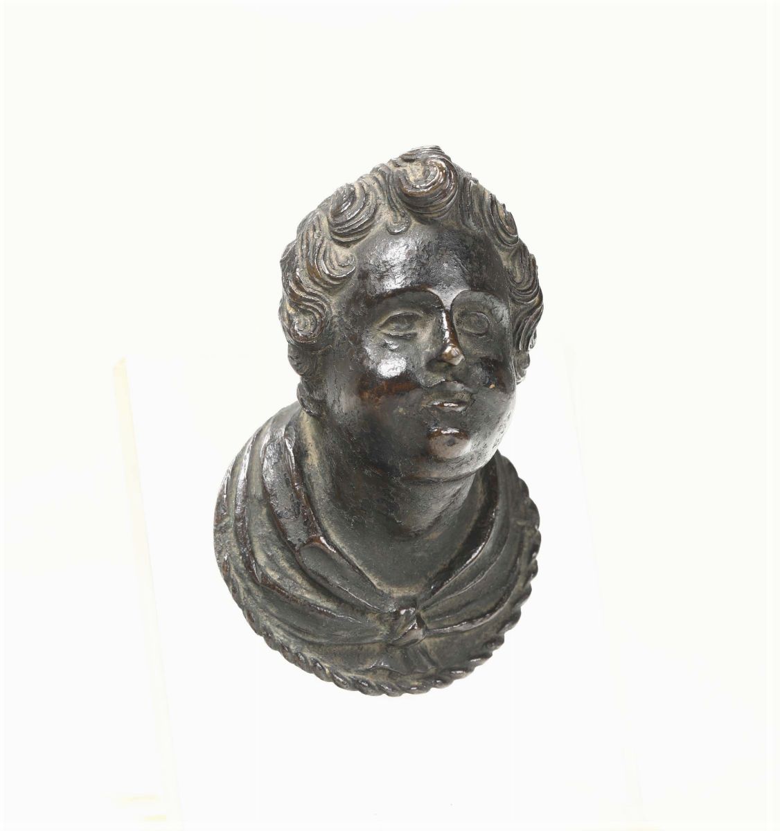 Pomello da portone in bronzo fuso a cera persa, in forma di baccante, periodo tardo rinascimentale, in patina antica. Veneto, [..]