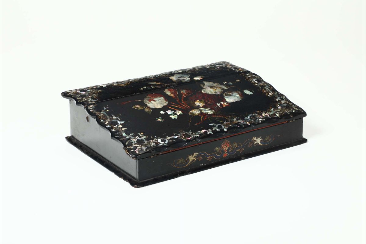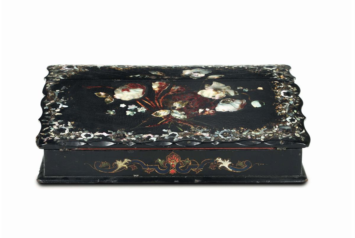 coperchio con decori intarsiati in madreperla a motivo floreale, scrittoio interno rivestito in panno rosso, cm 39x26x10
