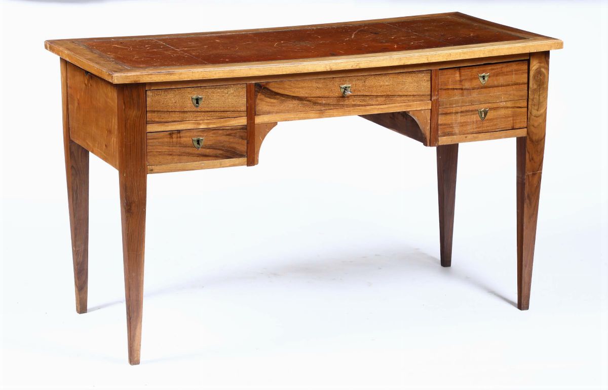 piano in pelle, gambe troncopiramidali, tiretto laterale estraibile, cm 127x60x76