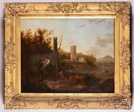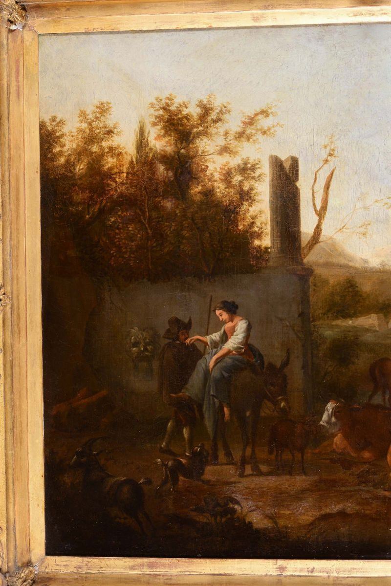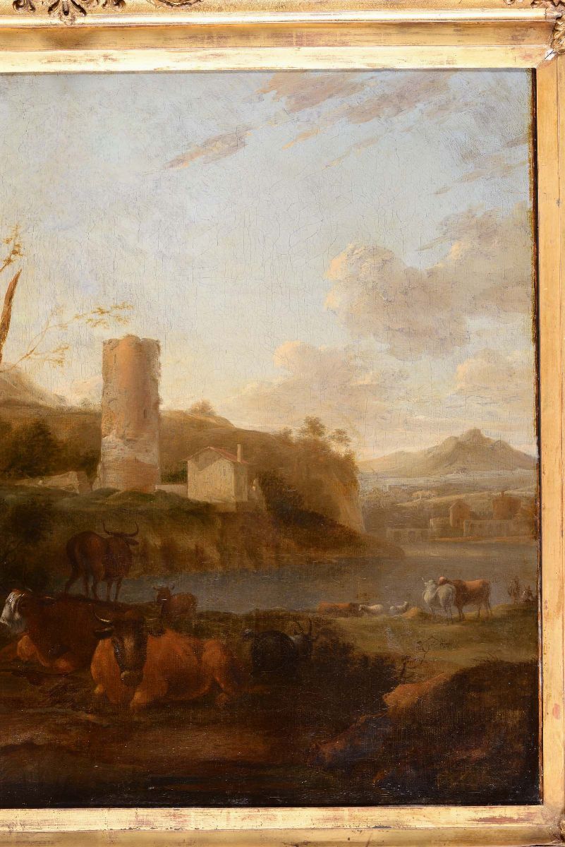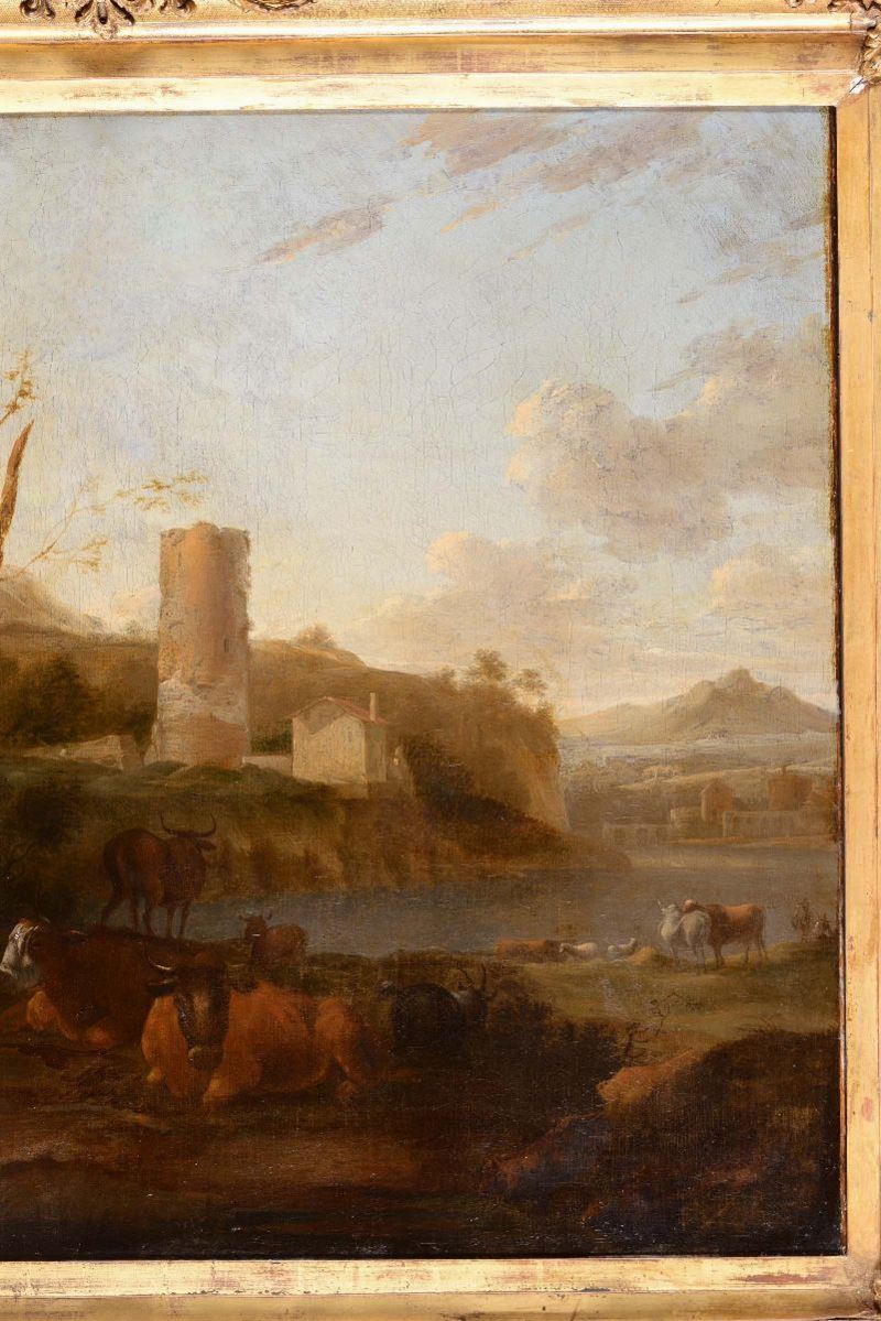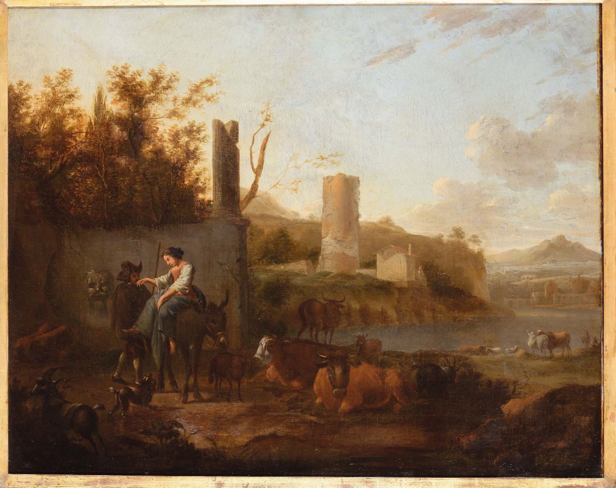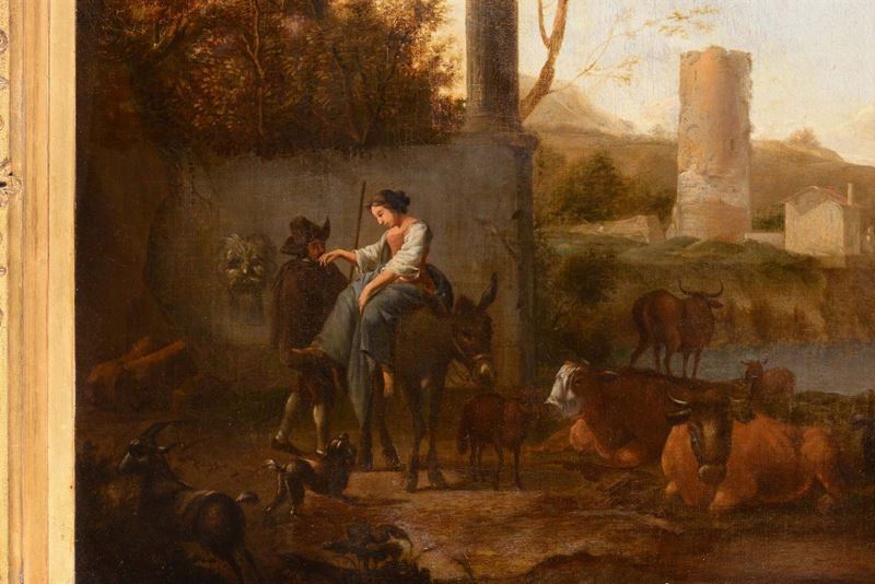 Scuola fiamminga del XVIII secolo Paesaggio con figure e armenti