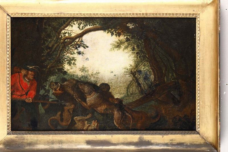 Scuola tedesca del XVII secolo Caccia al cinghiale
