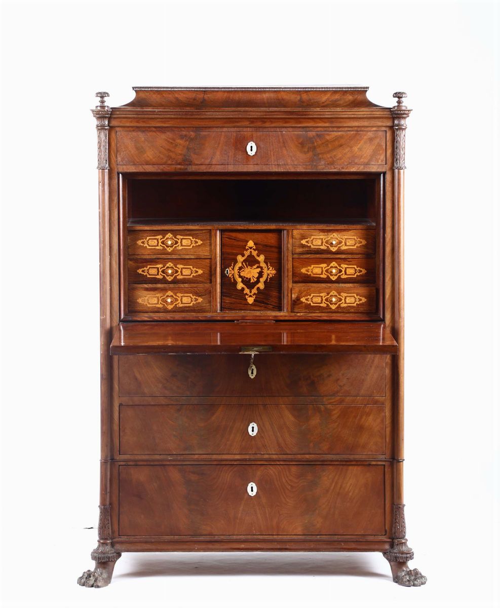tre cassetti alla base, calatoia celante cassettini e antina centrale in legno intarsiato, piedi ferini, cm 108x56x148