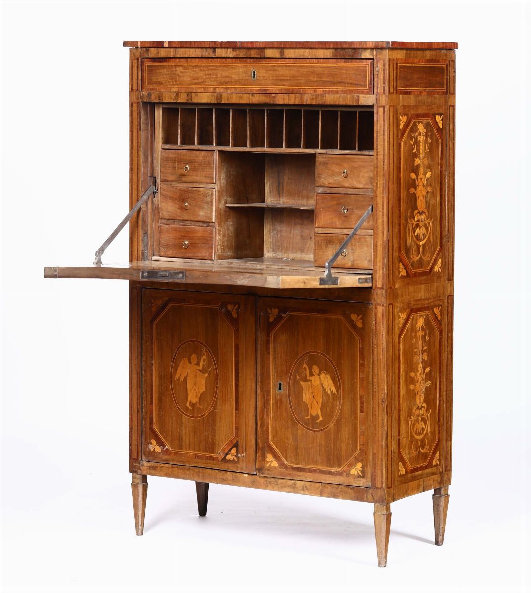 due ante alla base decorate con figure di angeli intarsiati al centro, calatoia con sei cassettini e vani portadocumenti all'interno, un cassetto sulla sommità, cm 91x39x146