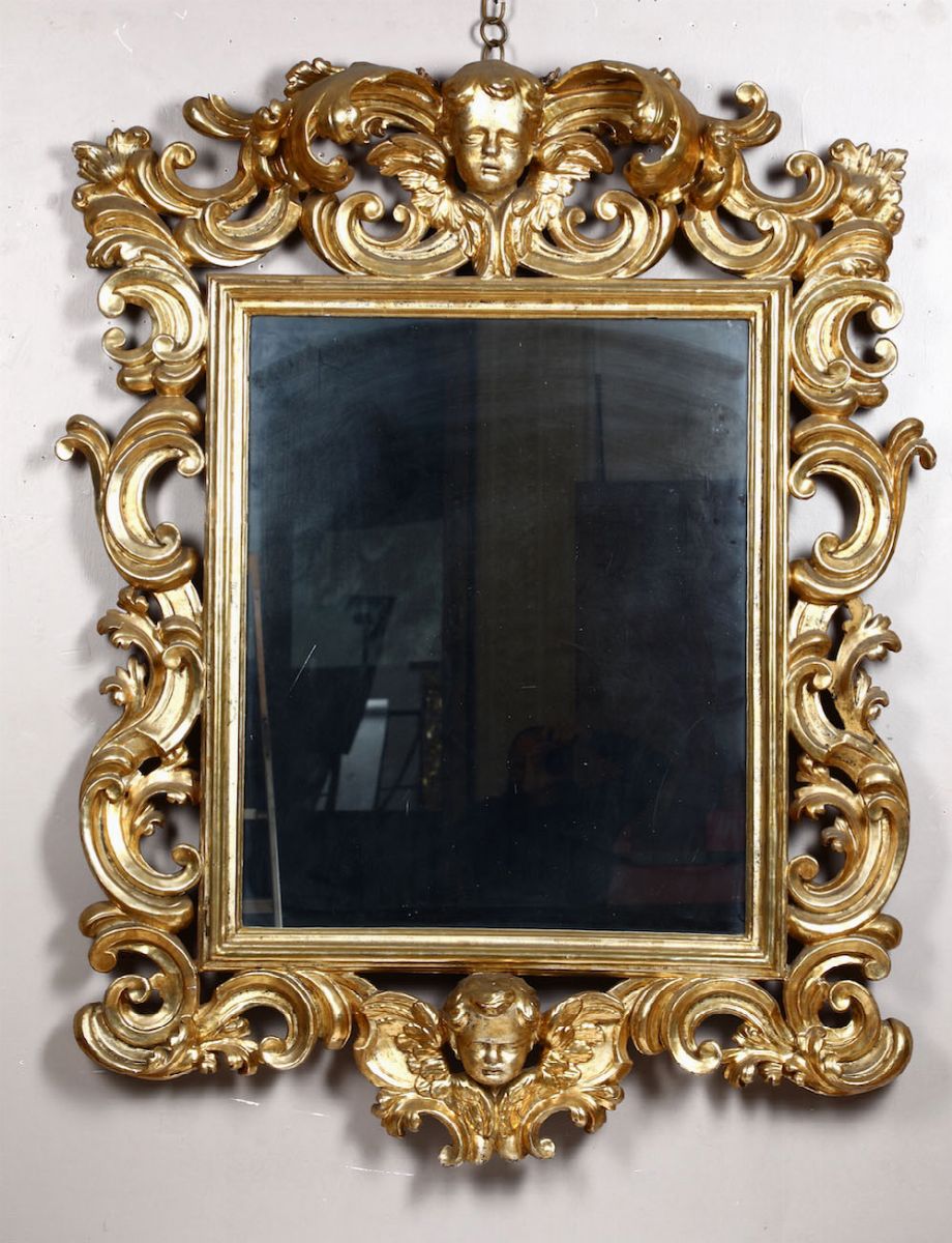 ricchi decori intagliati a volute, testine di putti alate ed elementi fogliacei, cm 160x118
