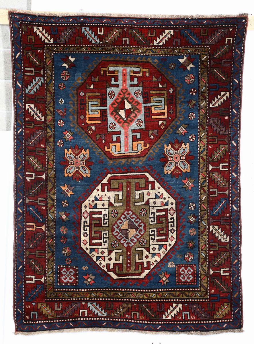campo blu/azzurro con due medaglioni ottagonali, bordura a foglie e calici, cm 205x152