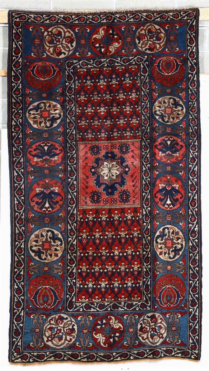 Campo rosso,ampia bordura azzurra con piccoli medaglioni, cm 155x280