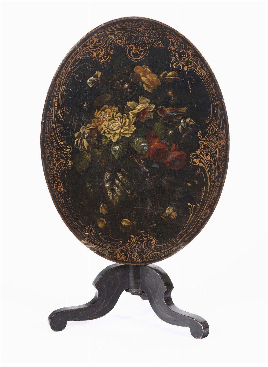 Tavolino in legno ebanizzato con piano ovale dipinto in policromia