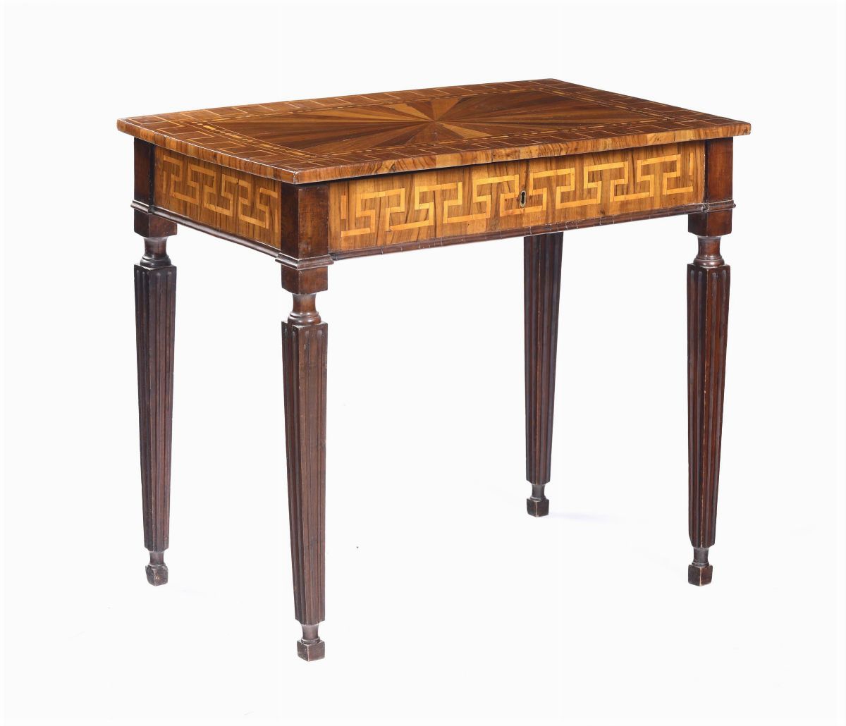 un cassetto sulla fascia intarsiata a motivo di “greca”, gambe troncopiramidali scanalate, cm 84x53x76