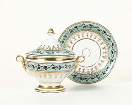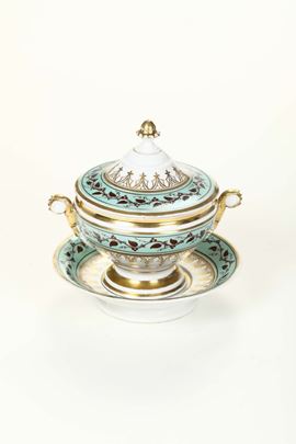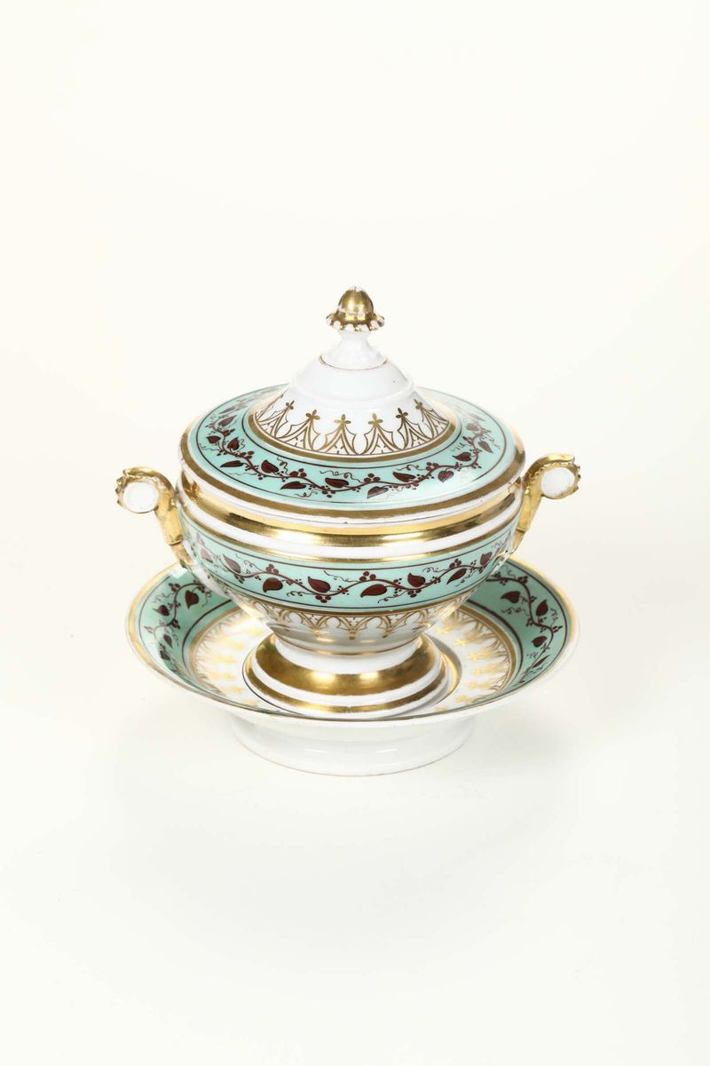 Tazza da brodo con coperchio e sottopiatto. Decorazione con nastro a rami di foglie di vite e cirri. Inoltre profilature in oro