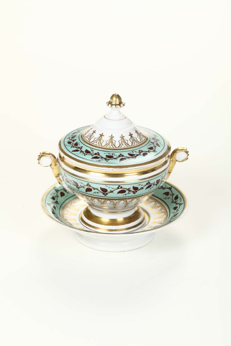 Porcellana. Marca: assente. Altezza totale cm 20,5; diametro del piatto cm 19,5. Piccola seccatura al bordo del coperchio; leggere usure all'oro