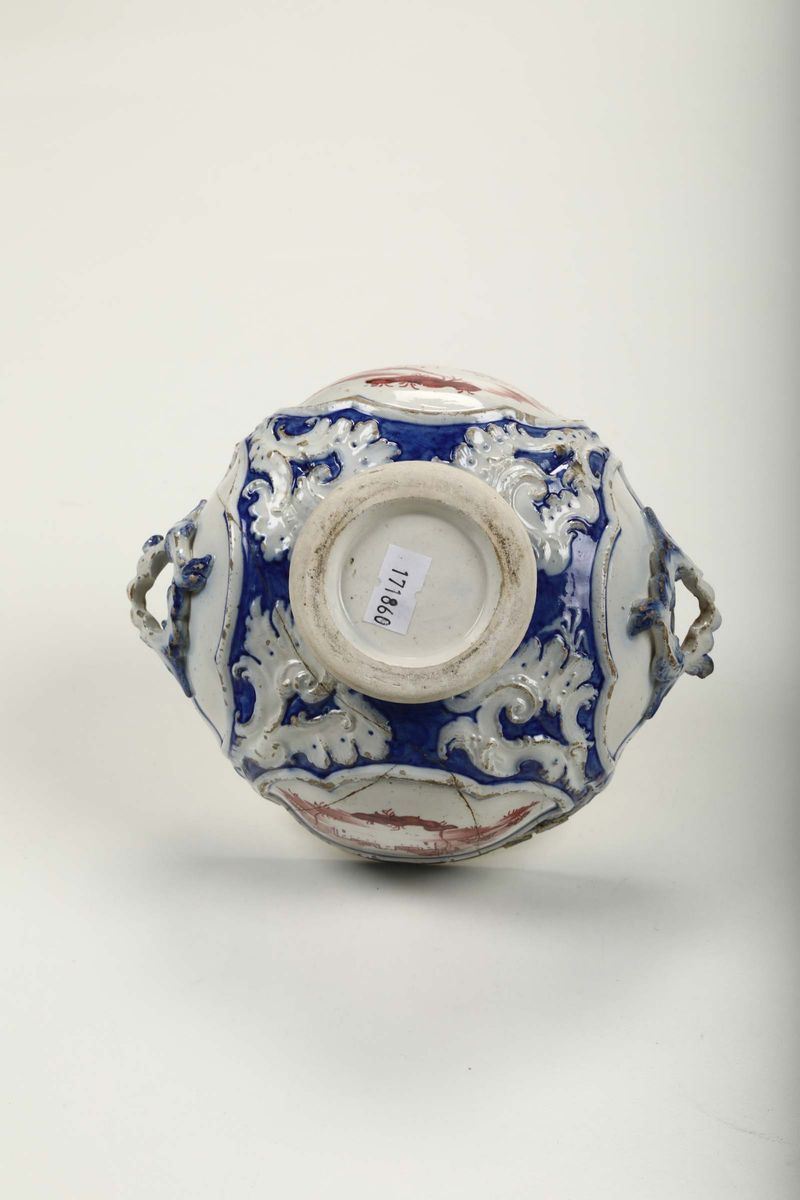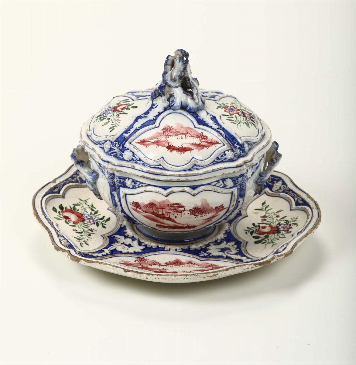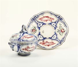 Tazza da brodo con coperchio e sottopiatto. Decorazione pittorica a paesaggi in monocromia rossa e a rami fioriti policromi racchiusi in riserve alternate tra rilievi plastici