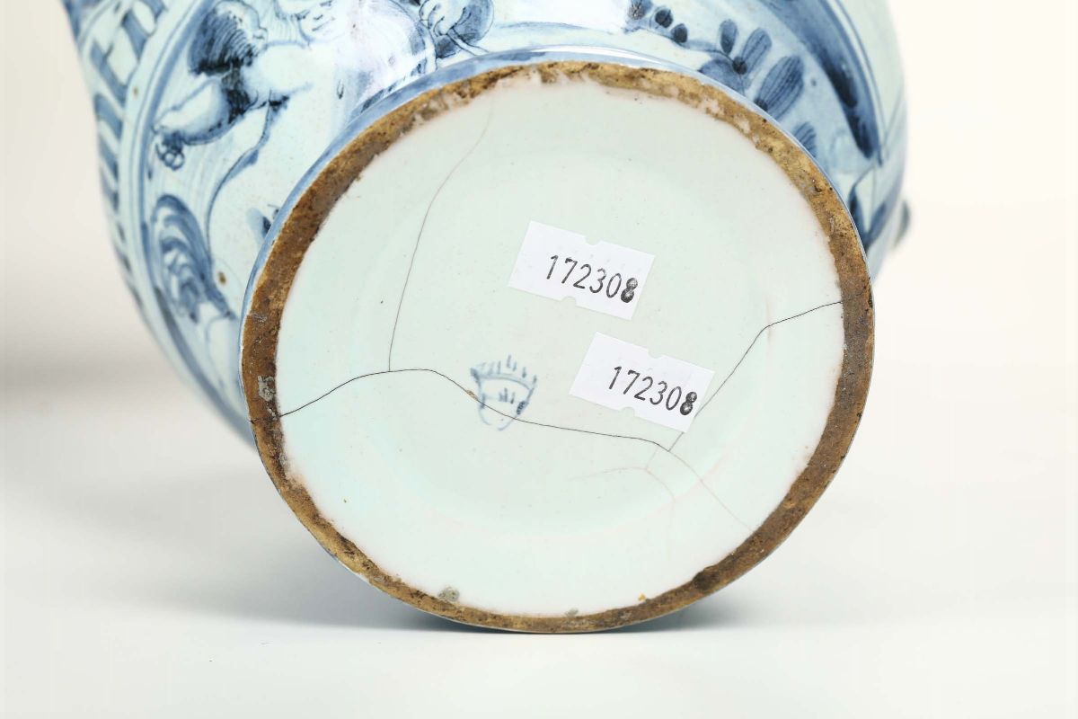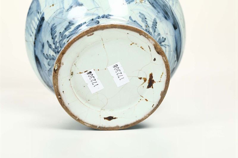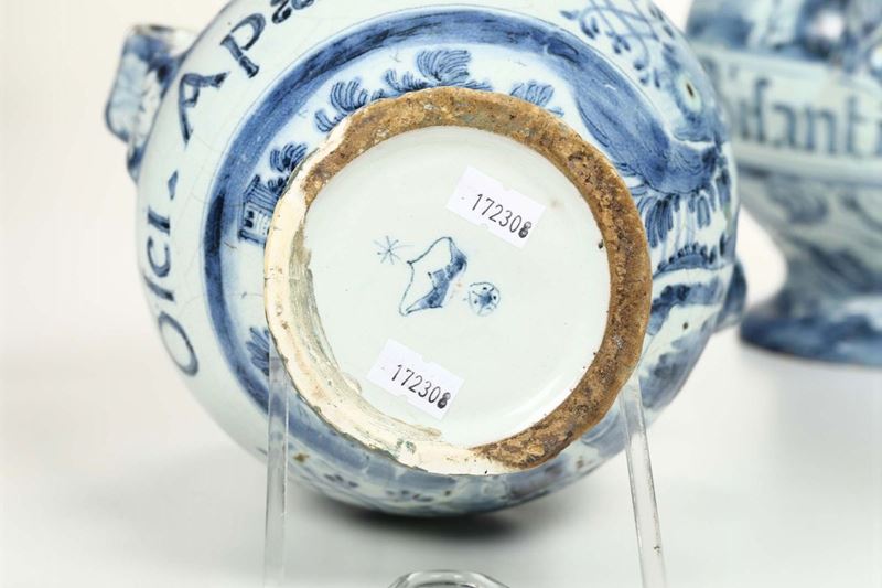 Raffigurano, in monocromia blu di cobalto, putti alati in ampio paesaggio. Inoltre ospitano un cartiglio con scritta apotecaria