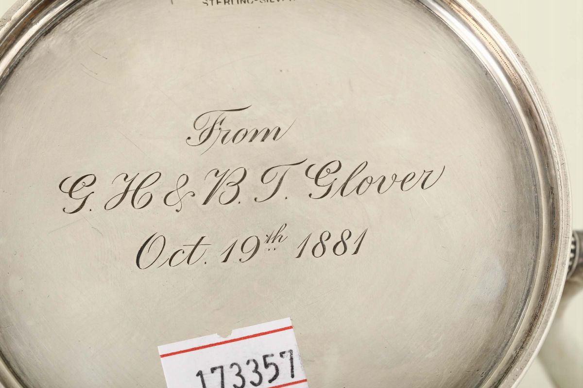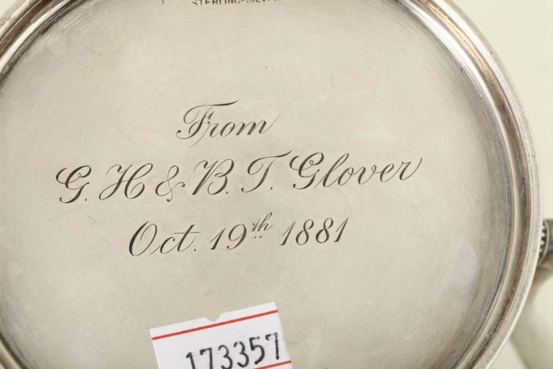 Tre pezzi in argento tra cui caffettiera Tiffany con dedica 1881