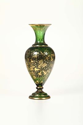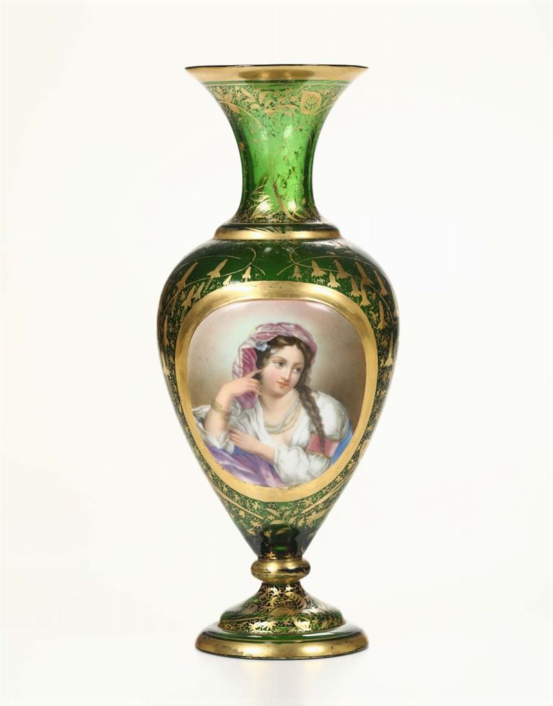 Vaso in vetro verde decorato con figura di donna in policromia, XX secolo