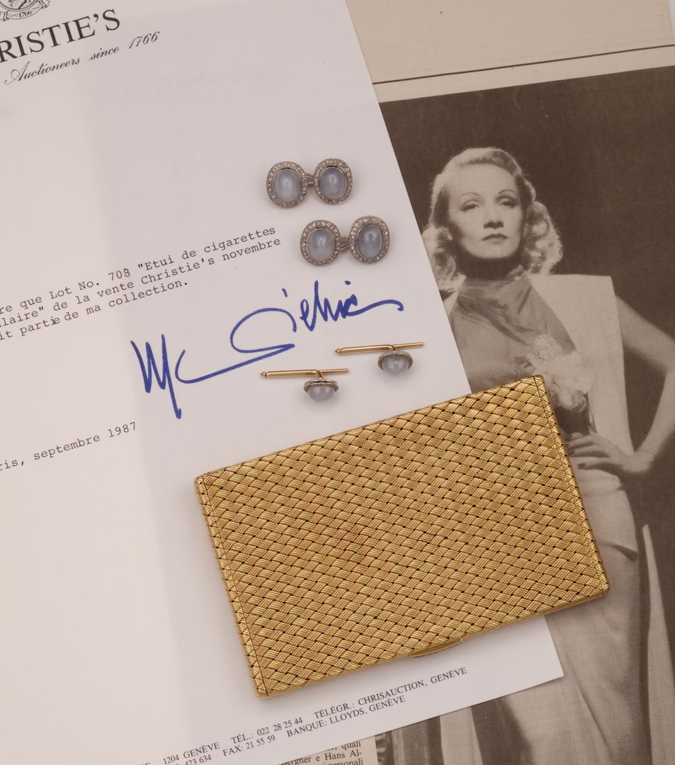 From the collection of Miss Marlene Dietrich: a pair of star sapphire and diamond cluster cufflinks with a pair of dress studs en suite. A gold cigarette case with sapphire push-piece. Each lot is sold with a letter signed by the artist