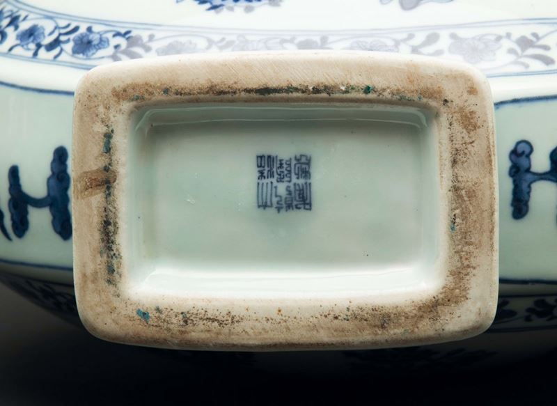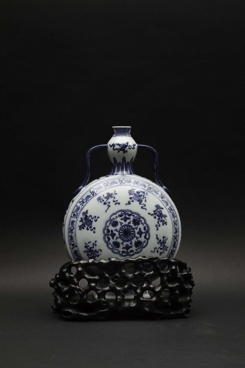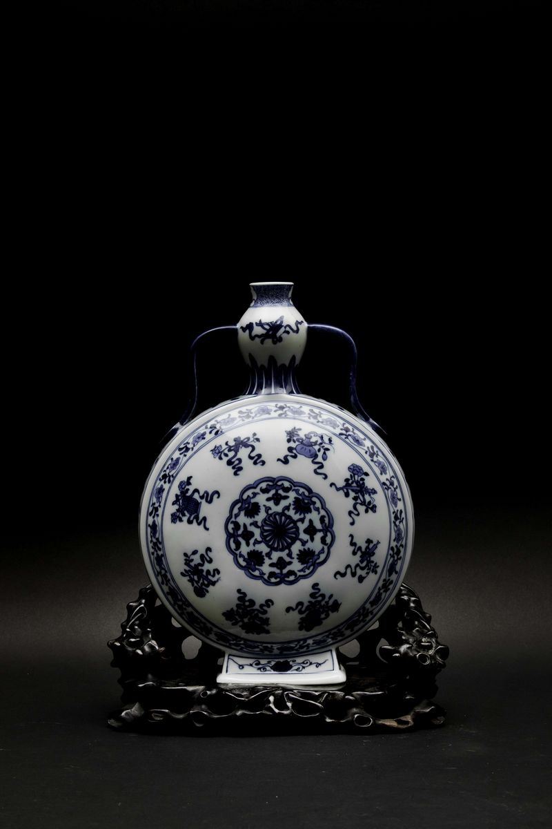 A blue and white porcelain flask with a central medallion and botanical decors on a carved wooden base, China, 20th centu [..]