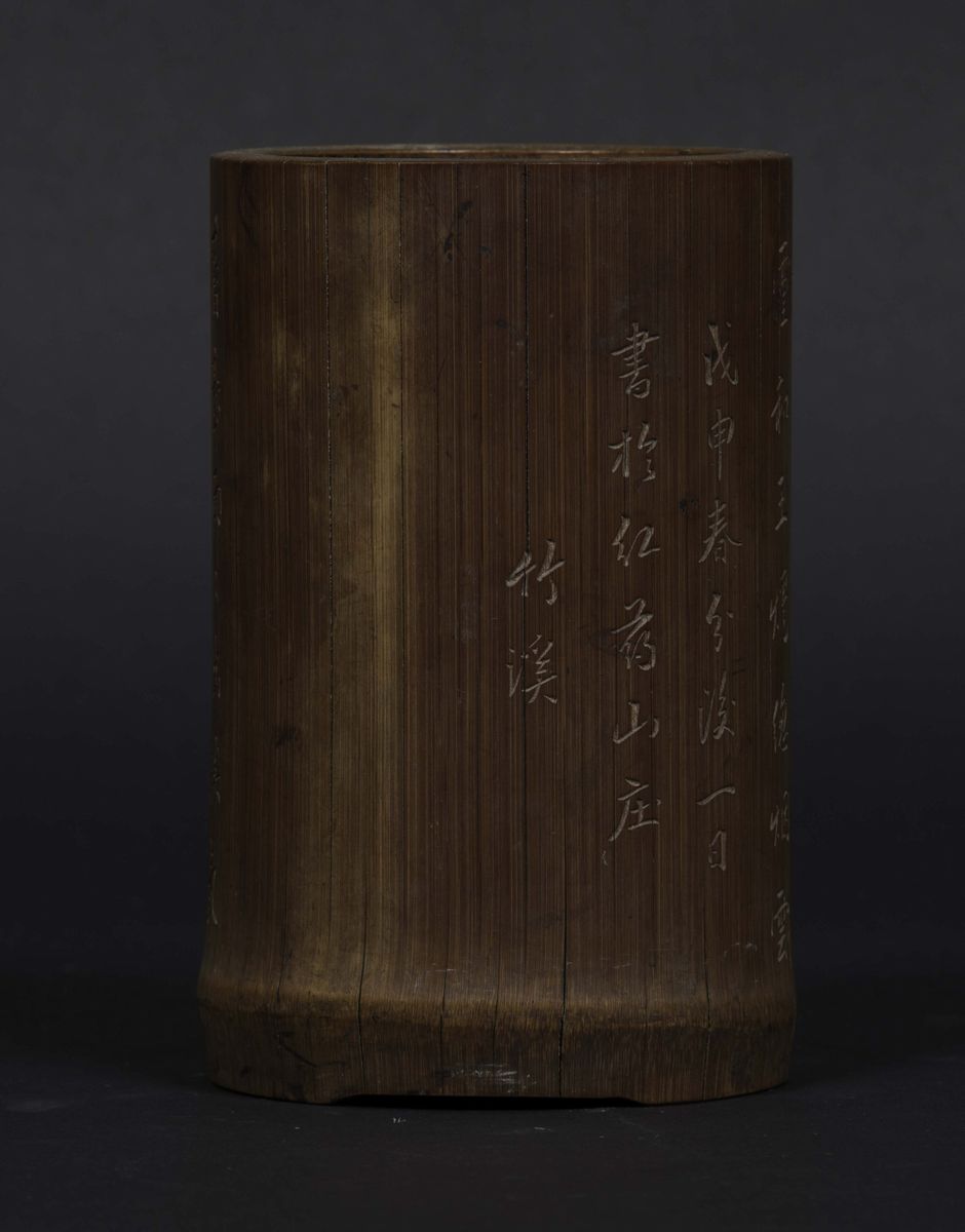 A carved bamboo wood brush holder with inscription, China, Qing Dynasty, Qianlong period (1736-1796)