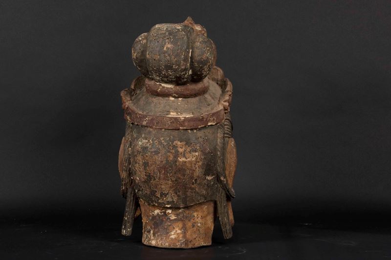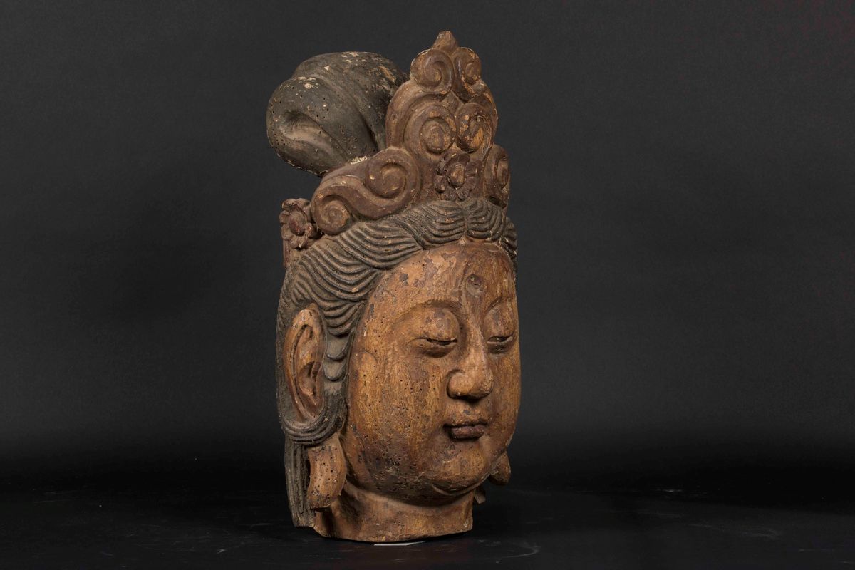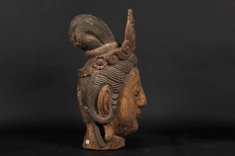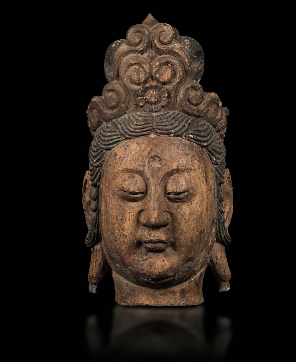 A carved wood crowned Buddha head with traces of polychromy, China, Ming Dynasty, 17th century
