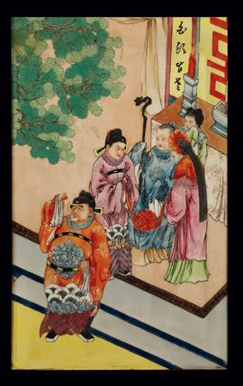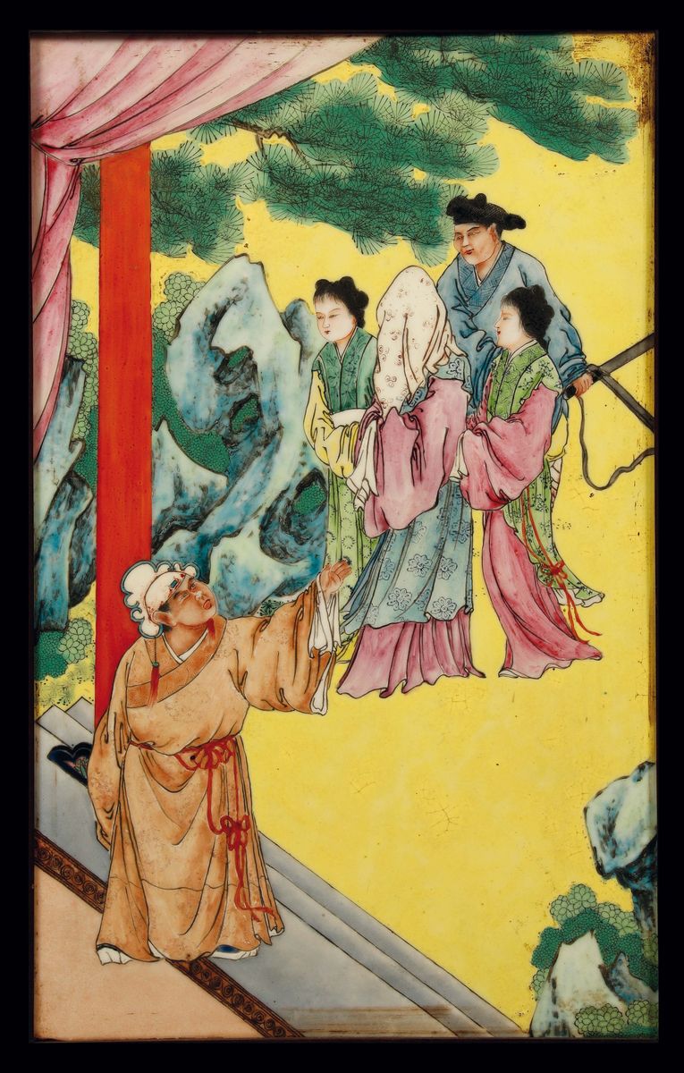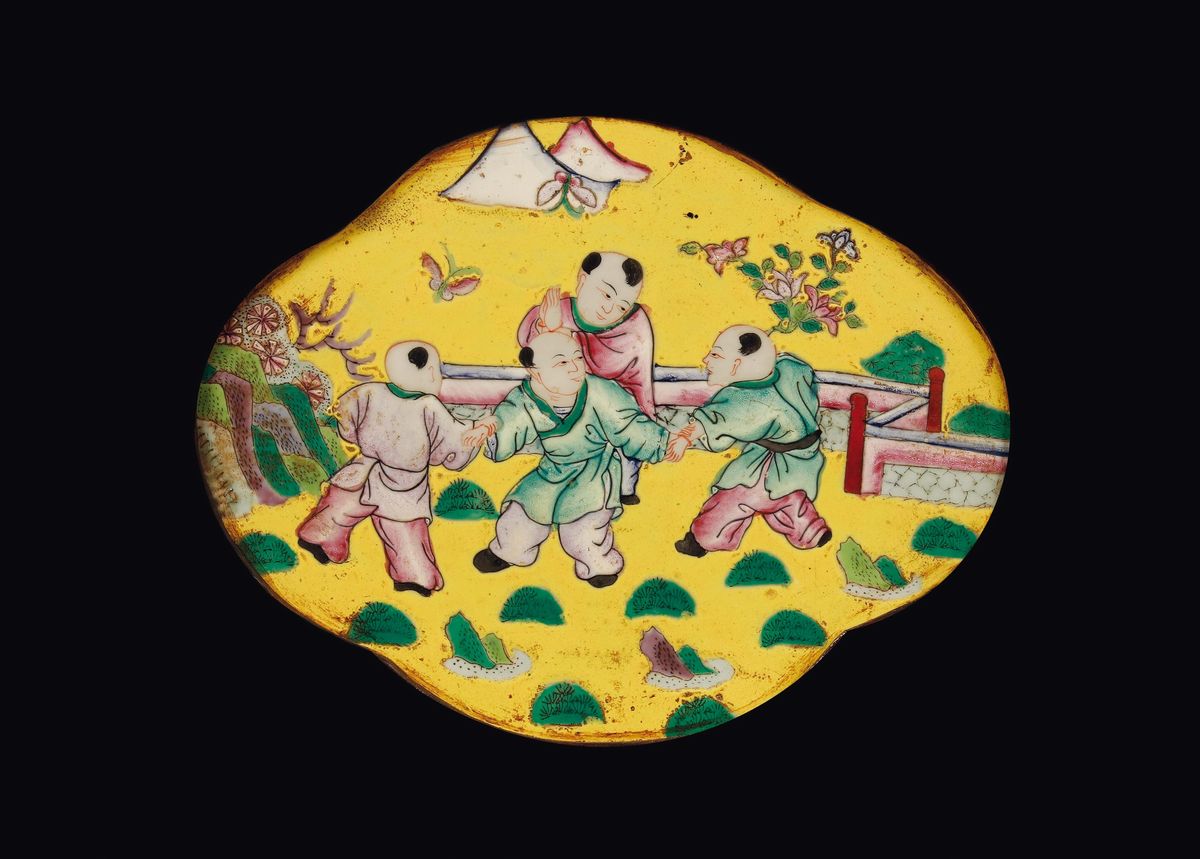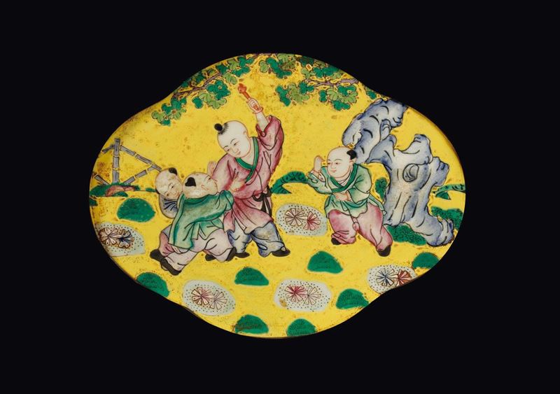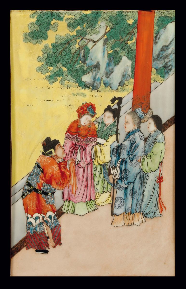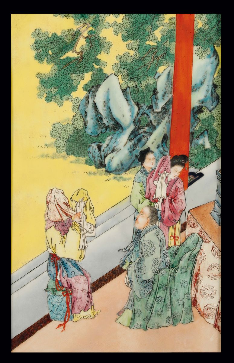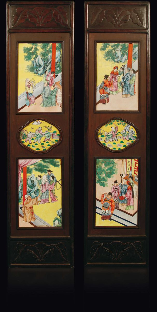 A double screen with polychrome glazed porcelain plaques and everyday life scenes, China, 20th century