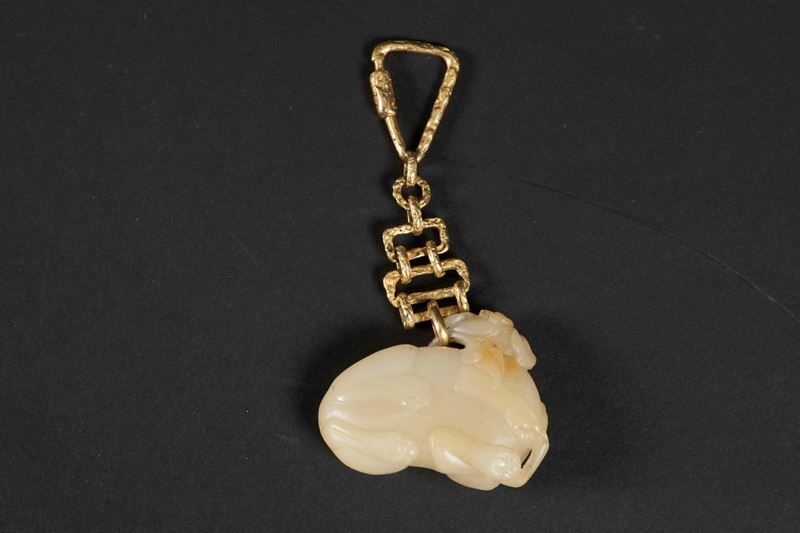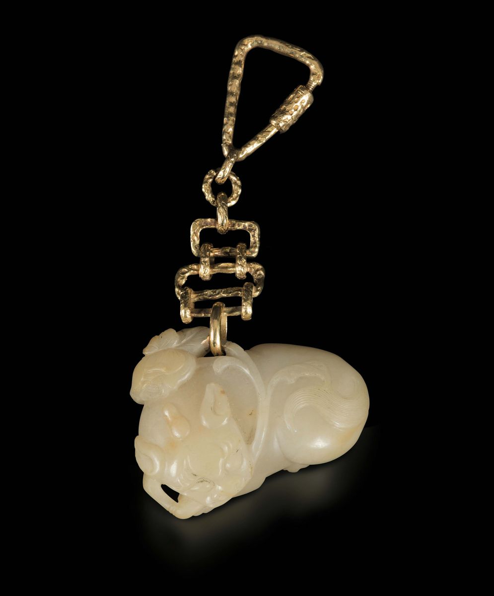 A gold keychain with a white jade fantasy animal and flower, China, Qing Dynasty, 18th century and 20th century