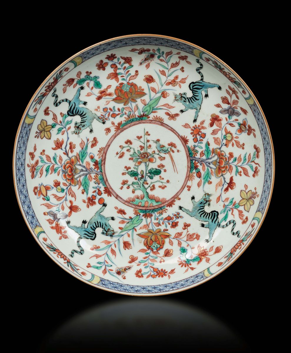 A Green Family or Wucai porcelain plate with a naturalistic decor of tigers, China, Qing Dynasty, Kangxi period (1662-172 [..]