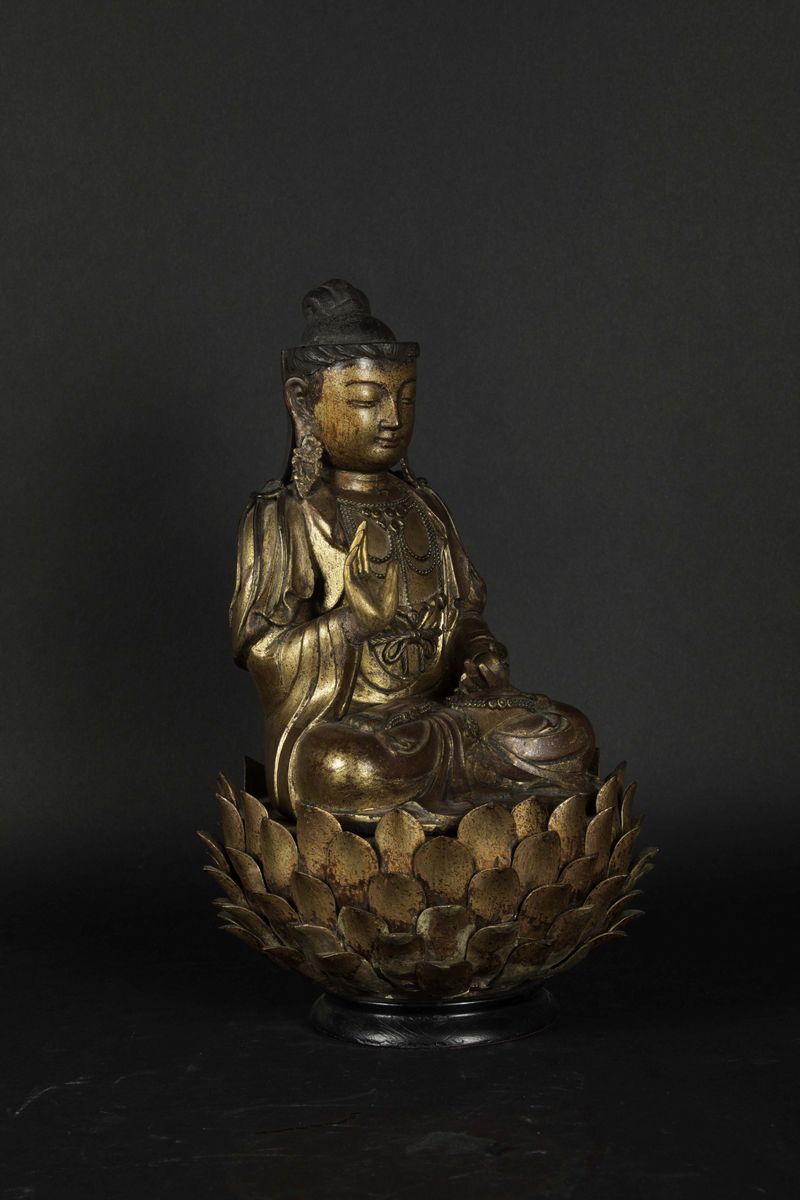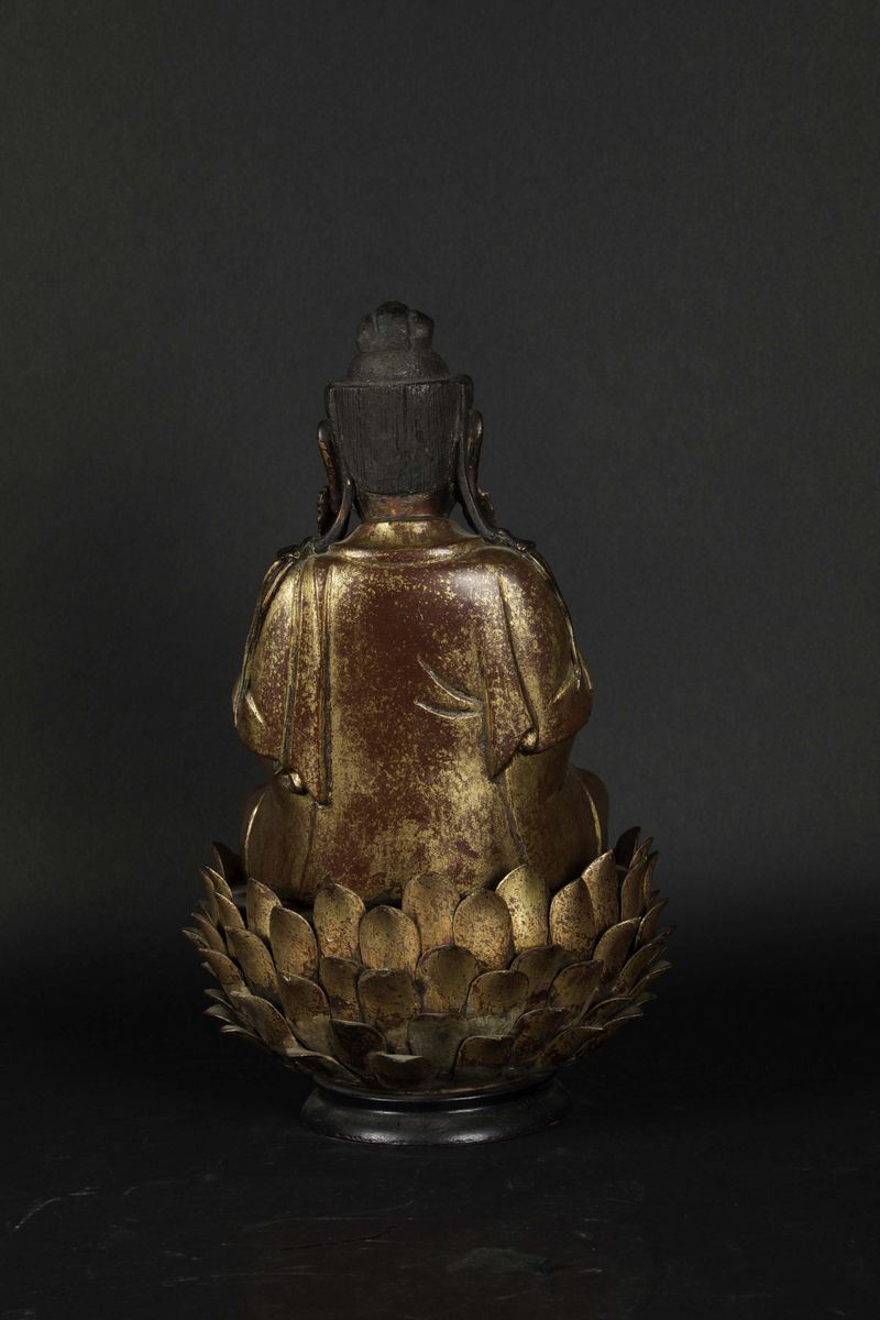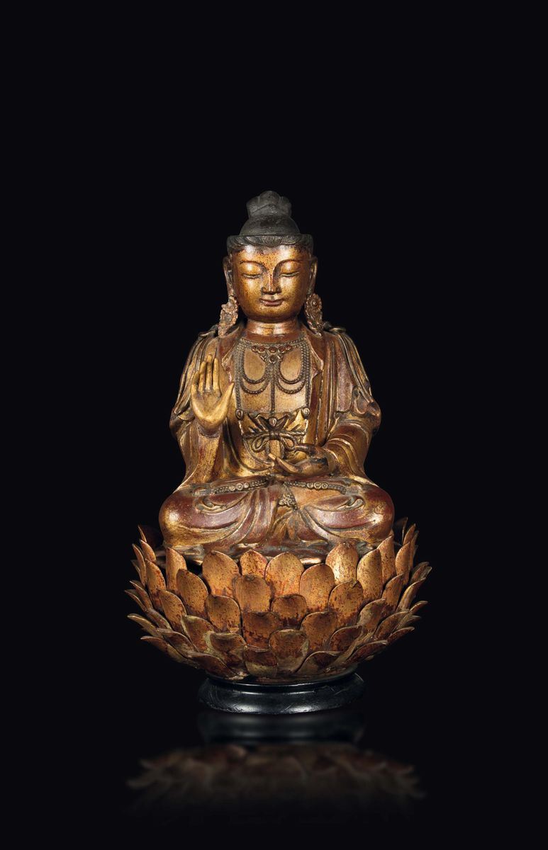A lacquered and gilded wood Buddha figure seated on a lotus flower, China, Ming Dynasty, half of the 17th century