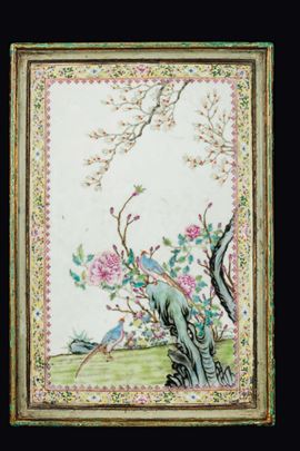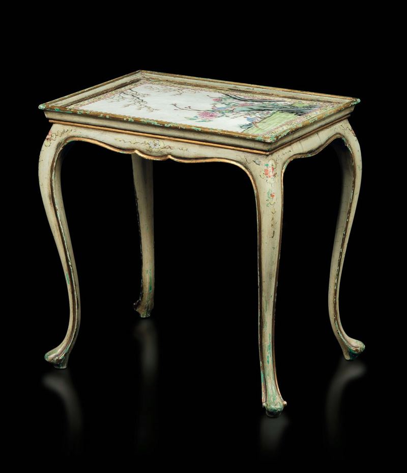 A lacquered table with golden decorations and a floral motif with a porcelain plaque depicting a blossoming cherry tree, [..]