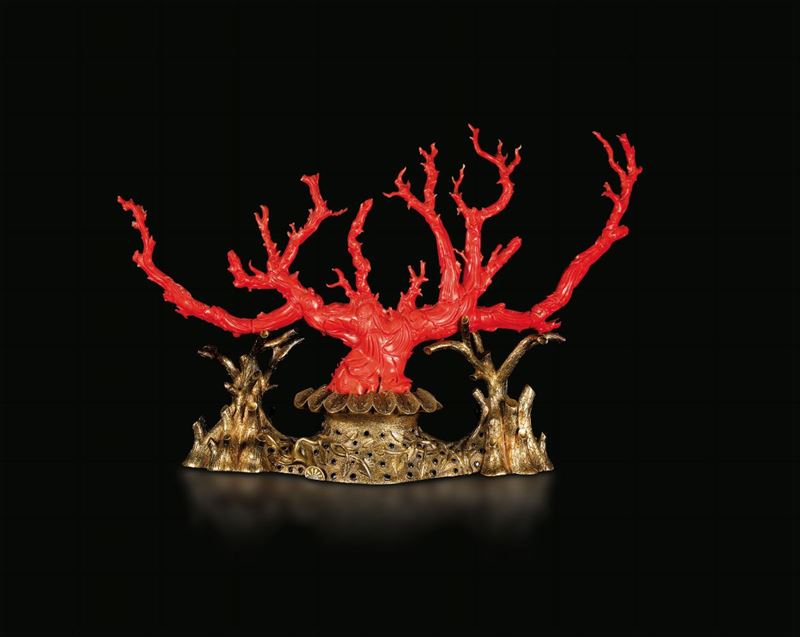 A large carved coral branch with everyday life scenes mounted on a gilt silver base with sapphire inlays, designed and manufactured [..]