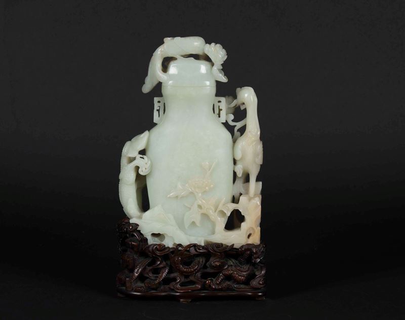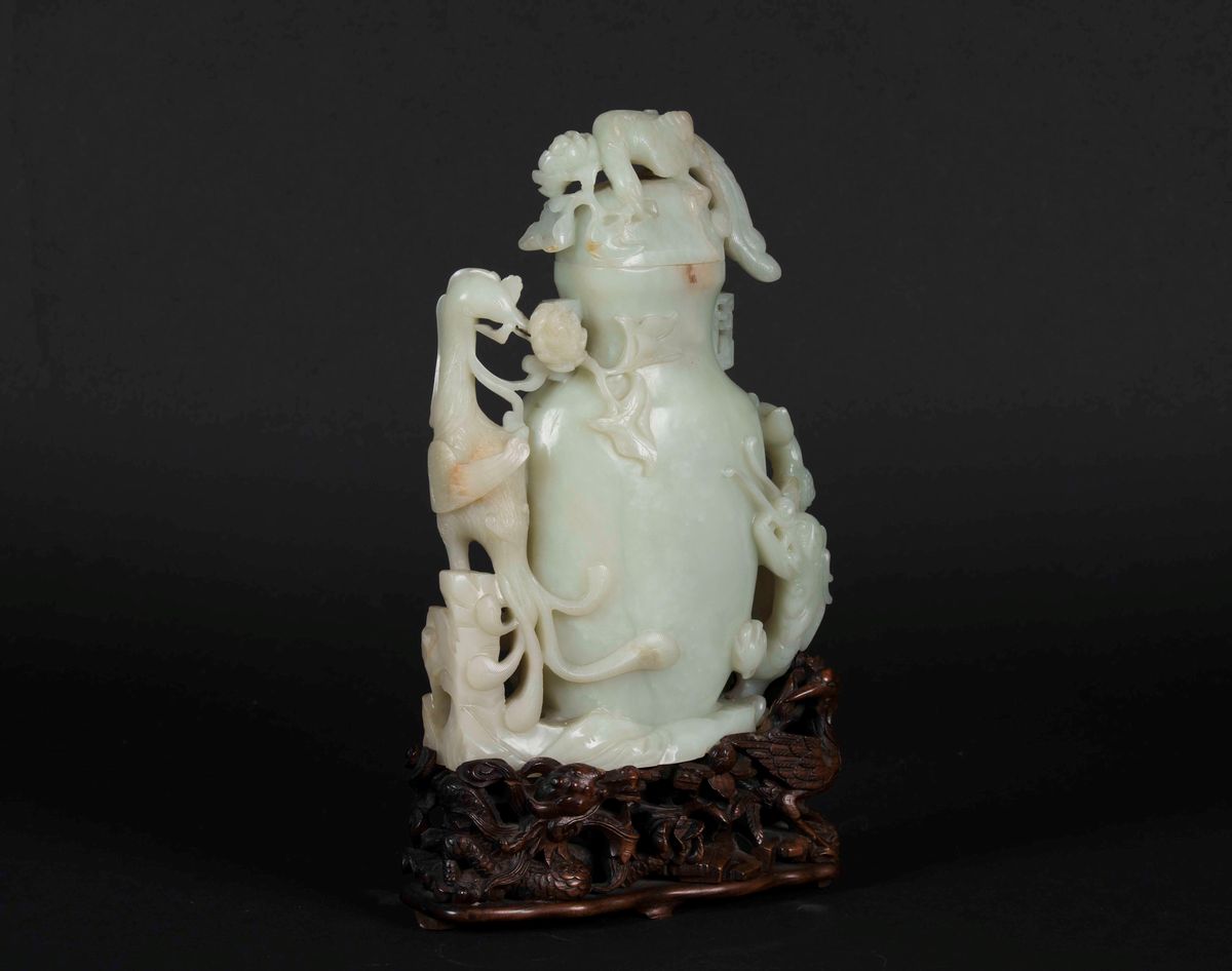 A large Celadon white jade vase and lid with animals and a finely carved wooden stand, China, Qing Dynasty, 19th century