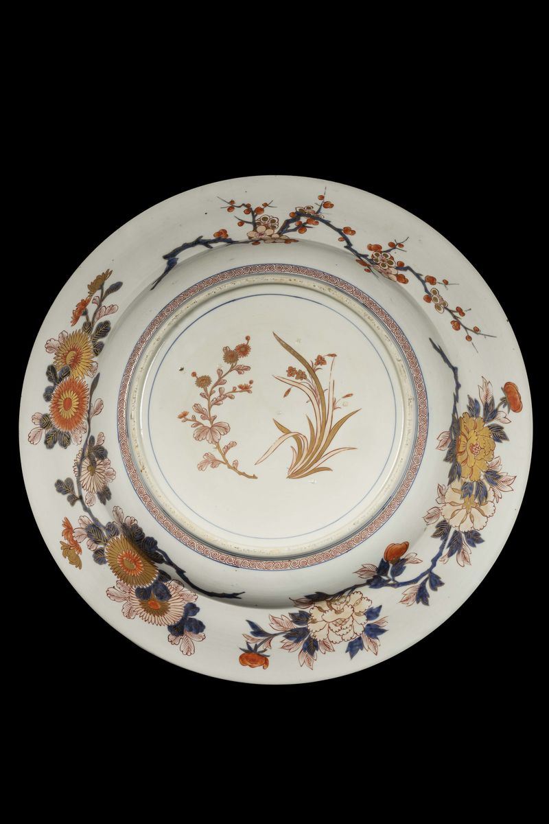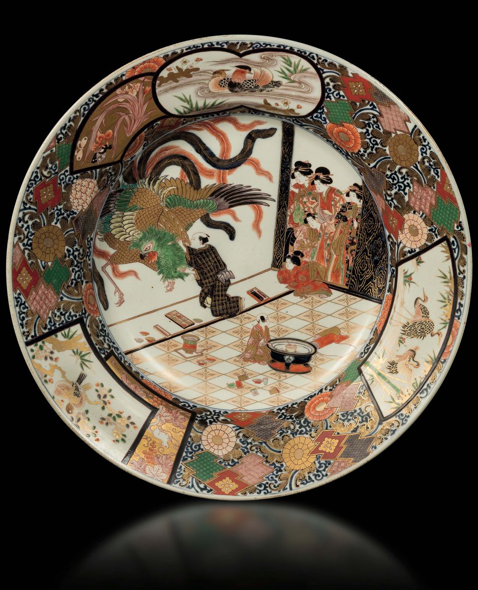 A large Imari porcelain plate with a central decor depicting a phoenix and Bijin, Japan, Amita period, 8th century