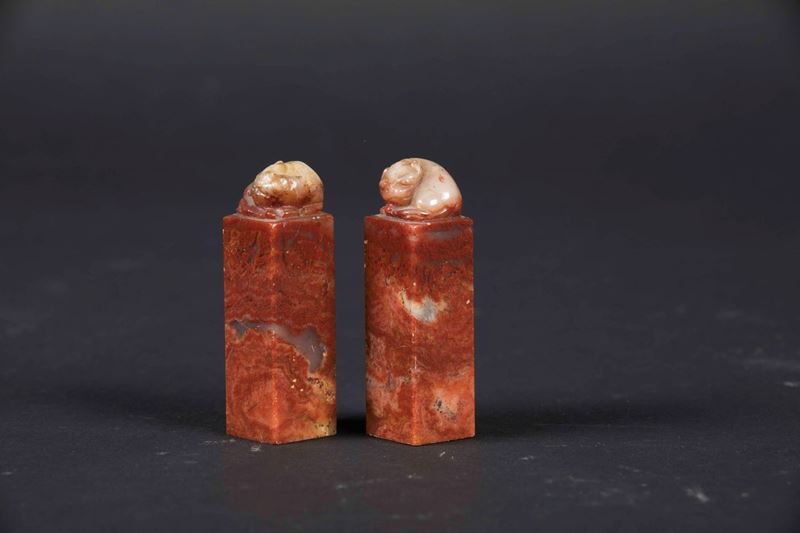 A pair of agate seals with feline figures, China, Qing Dynasty, 19th century