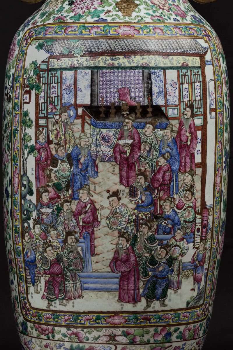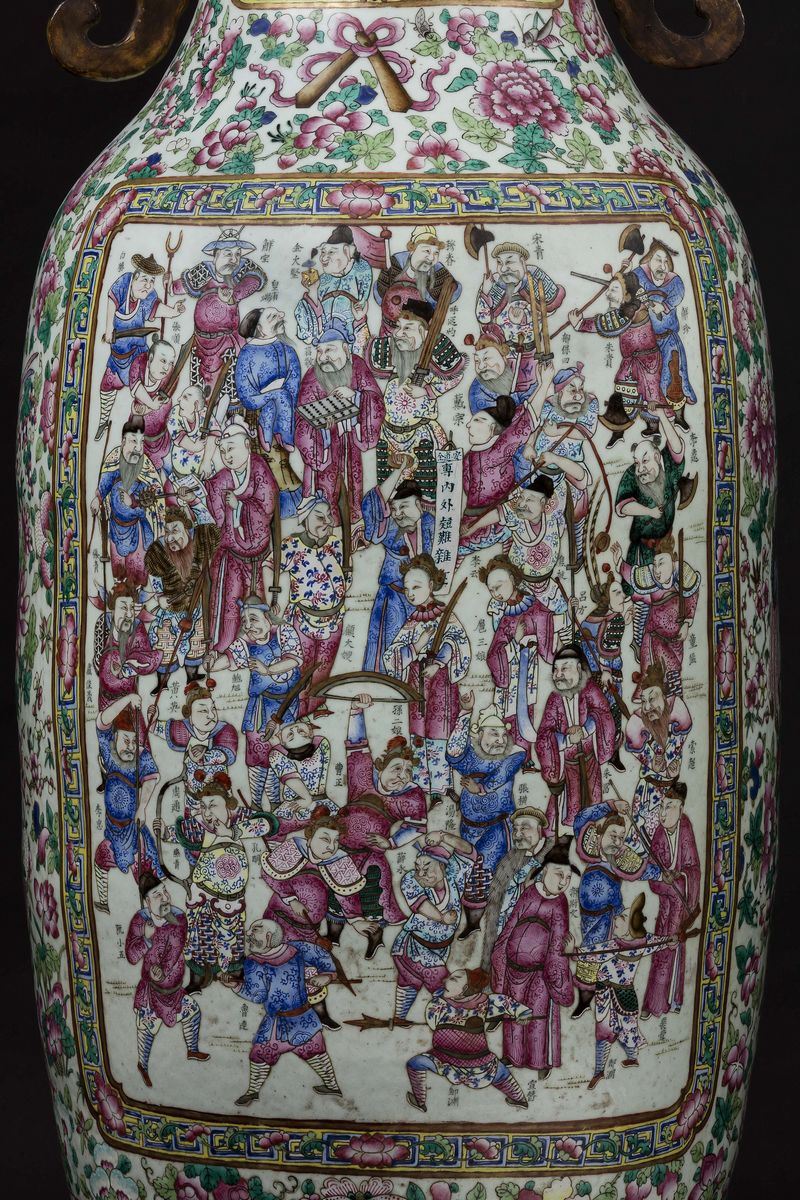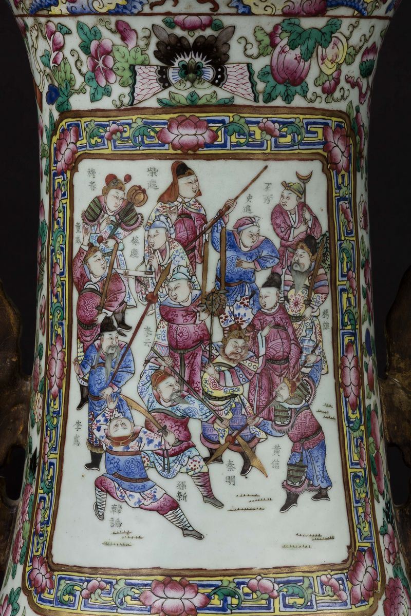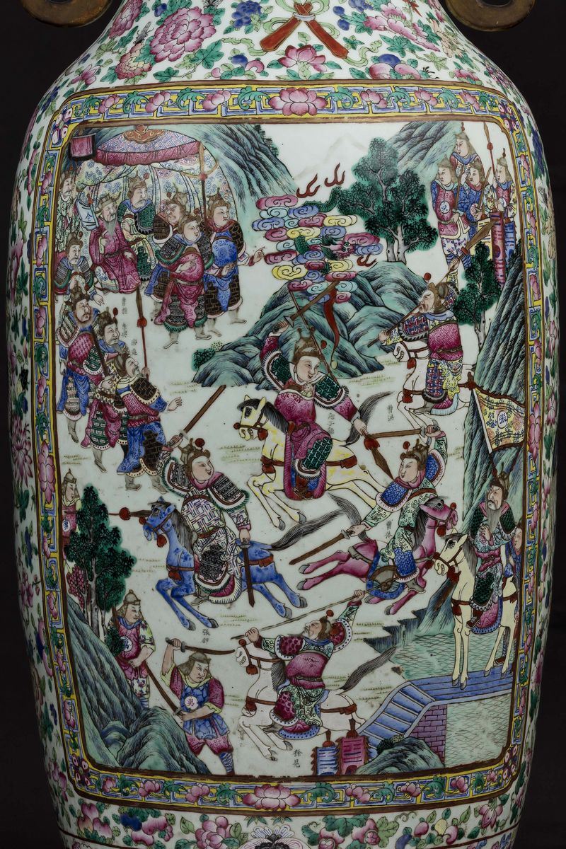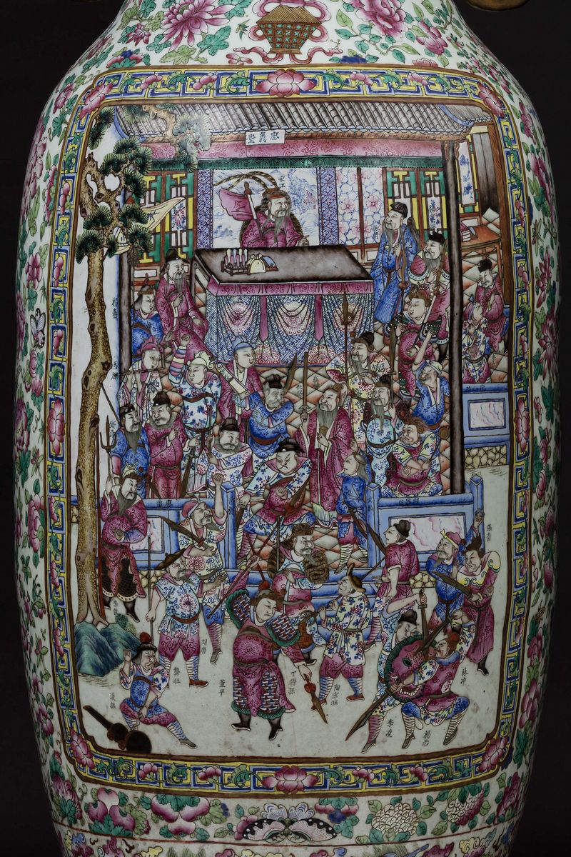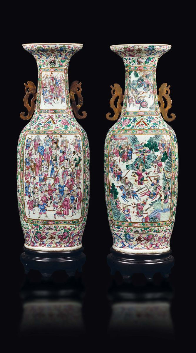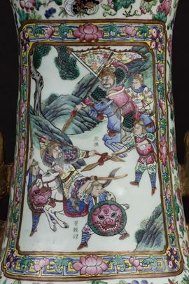 A pair of large and monumental double-handled Pink Family porcelain vases depicting battle scenes and court life, Qing Dynasty, [..]