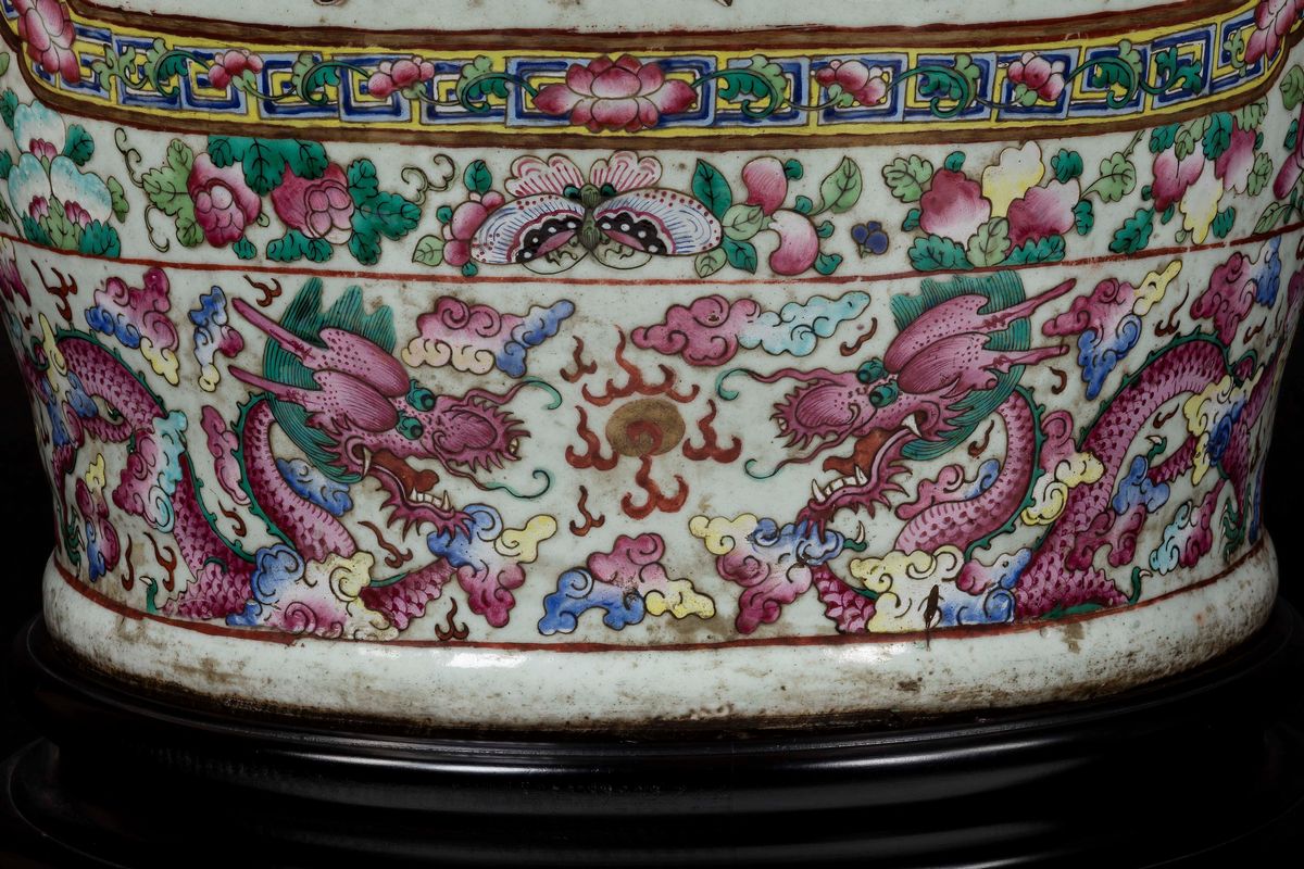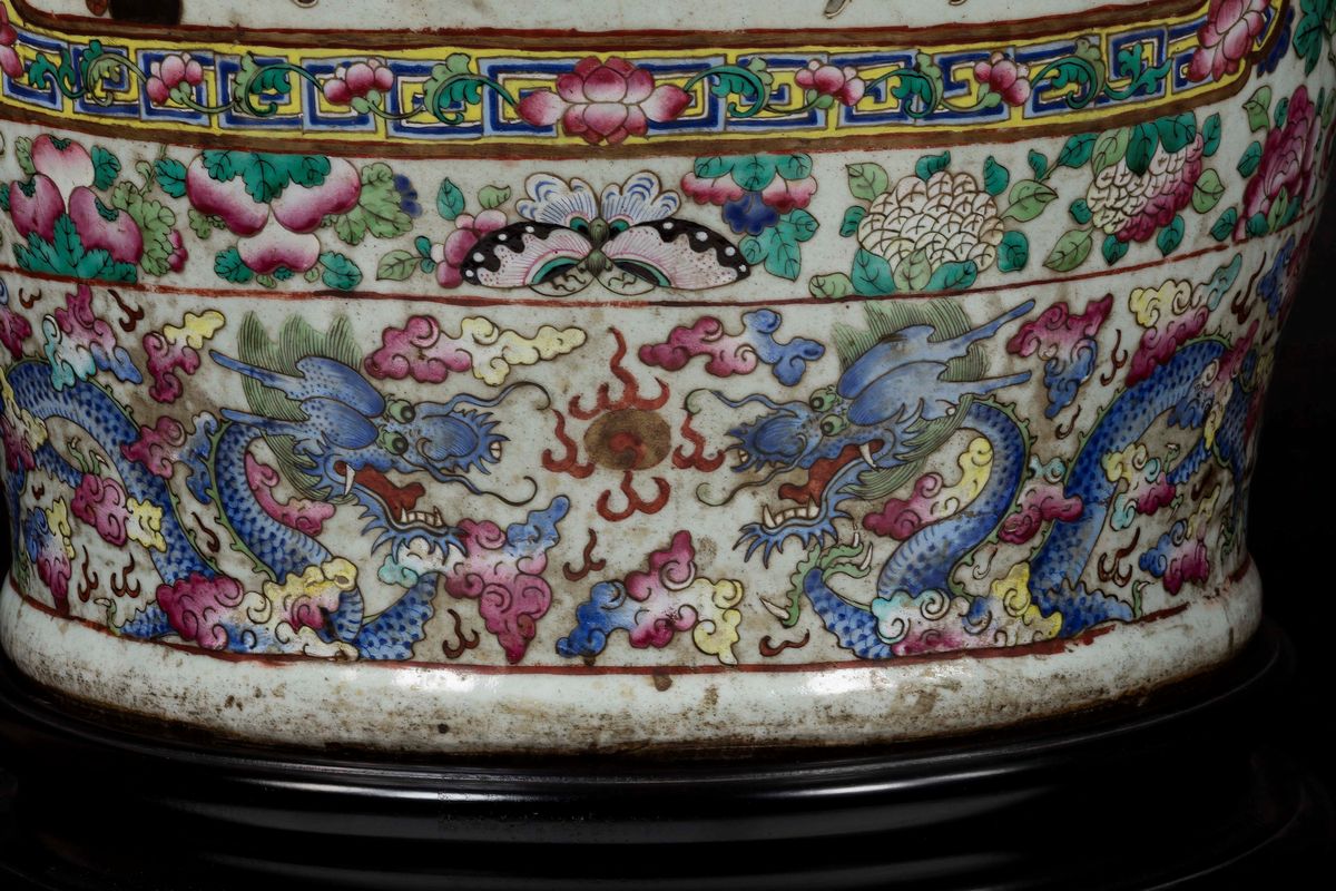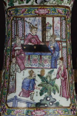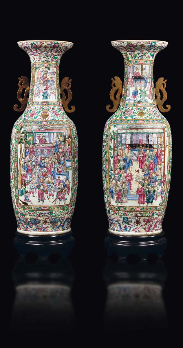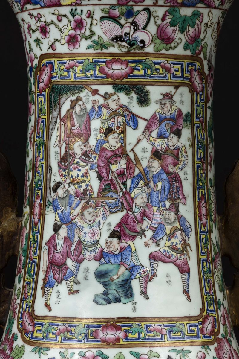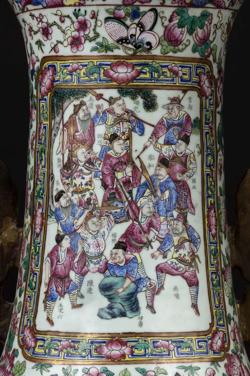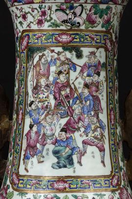 A pair of large and monumental double-handled Pink Family porcelain vases depicting battle scenes and court life, Qing Dynasty, [..]