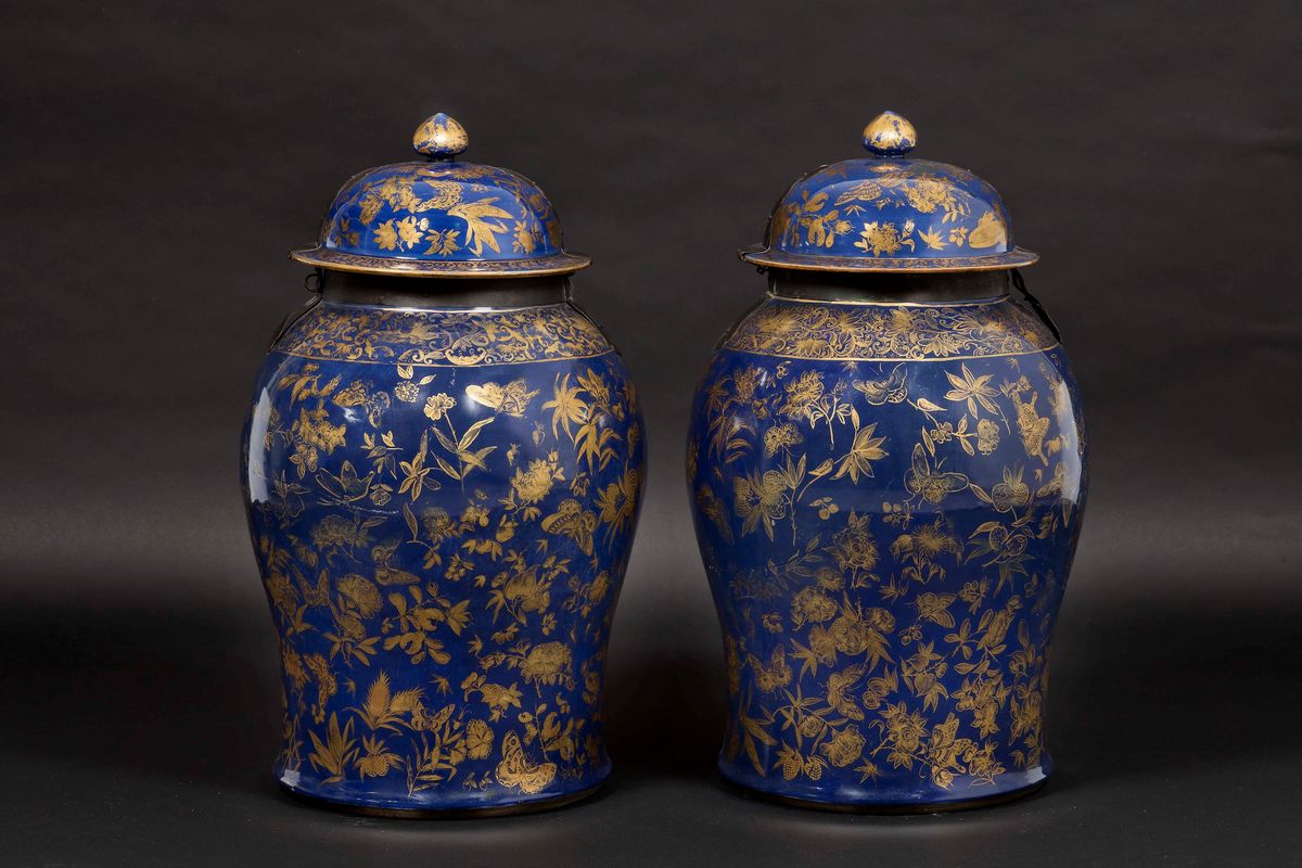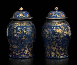 A pair of large porcelain potiches with lid with golden naturalistic decors on a blue backdrop, China, Qing Dynasty, Qianlong [..]